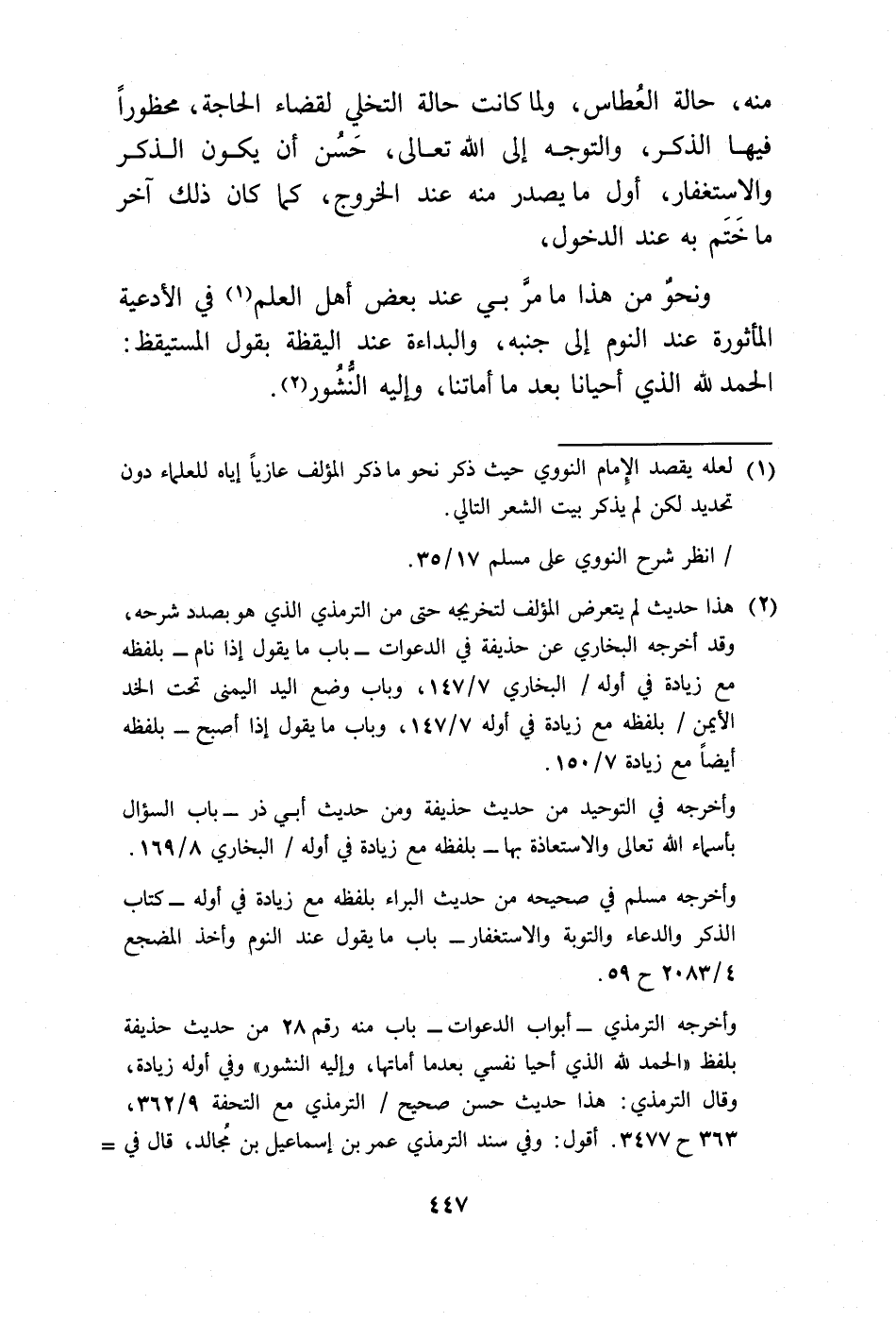 ونحوٌ من هذا ما مرَّ بي عند بعض أهل العلم (¬1) في الأدعية المأثورة عند النوم إلى جنبه، والبداءة عند اليقظة يقول المستيقظ: الحمد لله الذي أحيانا بعد ما أماتنا، وإليه النُّشُور (¬2).