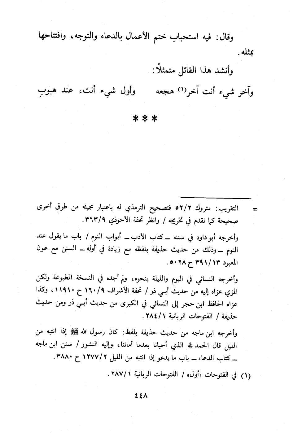 وأخرجه النسائي في اليوم والليلة بنحوه، ولم أجده في النسخة المطبوعة ولكن المزي عزاه إليه من حديث أبي ذر/ تحفة الأشراف 9/ 160 ح 11910، وكذا عزاه الحافظ ابن حجر إلى النسائي في الكبرى من حديث أبي ذر ومن حديث حذيفة/ الفتوحات الربانية 1/ 284.