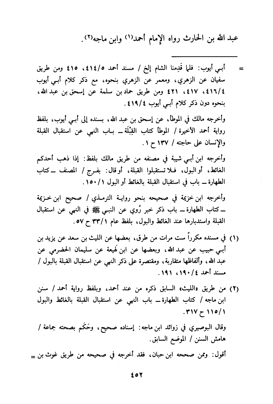 (¬1) في مسنده مكررًا ست مرات من طرق، بعضها عن الليث بن سعد عن يزيد بن أبي حبيب عن عبد الله، وبعضها عن ابن لَهيعة عن سليمان الحضرمي عن عبد الله، وألفاظها متقاربة، ومقتصرة على ذكر النهي عن استقبال القبلة بالبول/ مسند أحمد 4/ 190، 191.