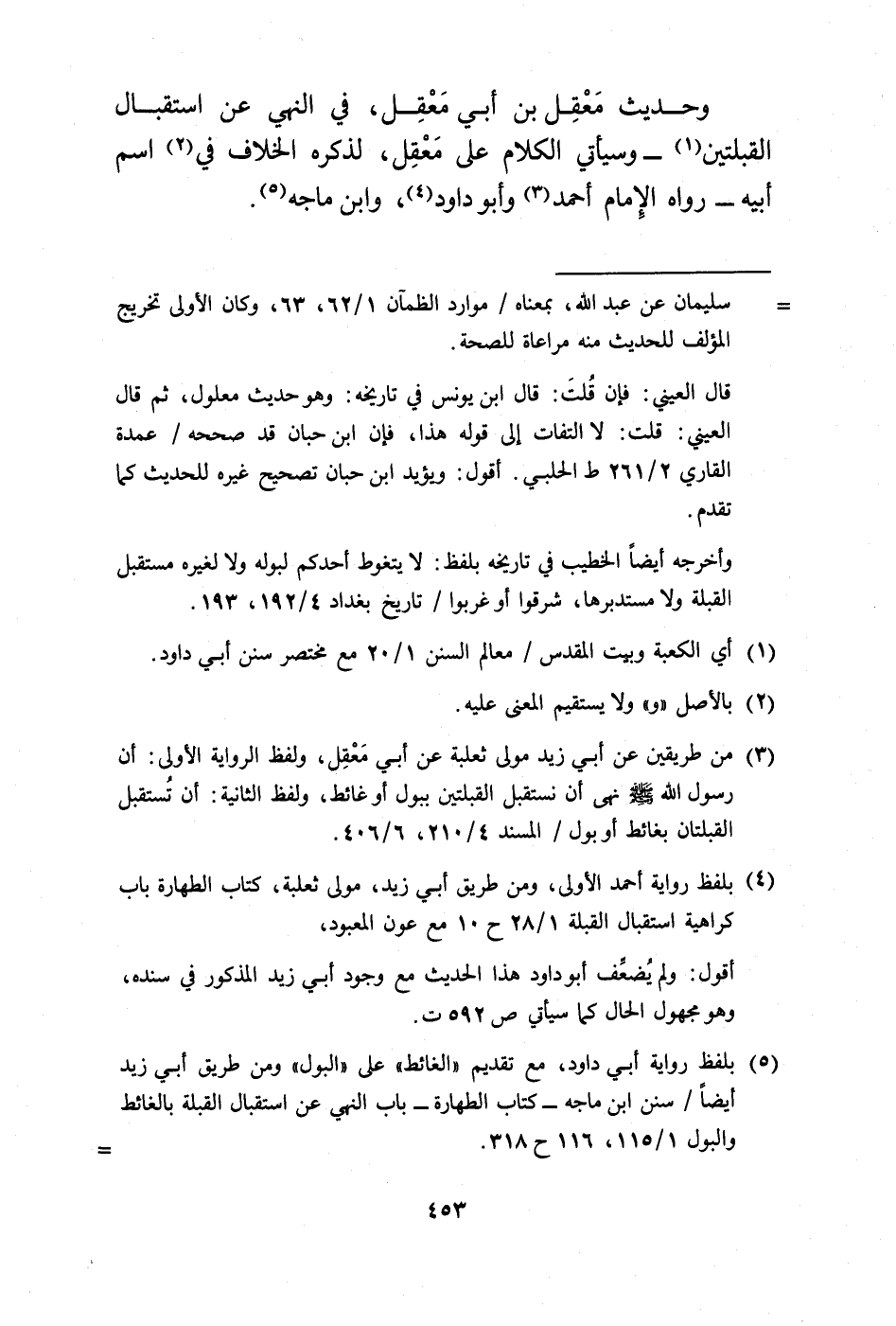 (¬4) بلفظ رواية أحمد الأولى، ومن طريق أبي زيد، مولى ثعلبة، كتاب الطهارة باب كراهية استقبال القبلة 1/ 28 ح 10 مع عون المعبود.