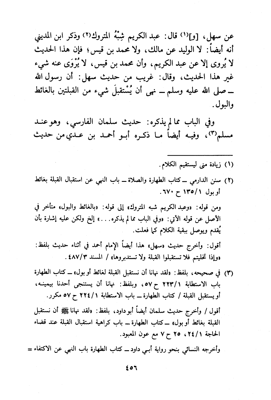 عن سهل، [و] (¬1) قال: عبد الكريم شِبْهُ المتروك (¬2) وذكر ابن المديني أنه أيضًا: لا الوليد عن مالك، ولا محمد بن قيس؛ فإن هذا الحديث لا يُروى إلا عن عبد الكريم، وأن محمد بن قيس، لا يُرْوَى عنه شيء غير هذا الحديث، وقال: غريب من حديث سهل: أن رسول الله -صلى الله عليه وسلم- نهى أن يُسْتقبلَ شيء من القبلتين بالغائط والبول.
