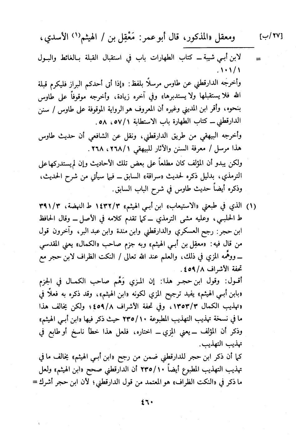 أقول: وقول ابن حجر هذا: إن المزي وَهَّم صاحب الكمال في الجزم "بابن أبي الهيثم" يفيد ترجيح المزي لكونه "ابن الهيثم"، وقد ذكره به فعلًا في "تهذيب الكمال 3/ 1353، وفي تحفة الأشراف 8/ 459؛ ولكن يخالف هذا ما في نسخة تهذيب التهذيب المطبوعة 10/ 235 حيث ذكر فيها "ابن أبي الهيثم" وذكر أن المؤلف -يعني المِزي- اختاره، فلعل هذا خطأ ناسخ أو طابع في تهذيب التهذيب.
