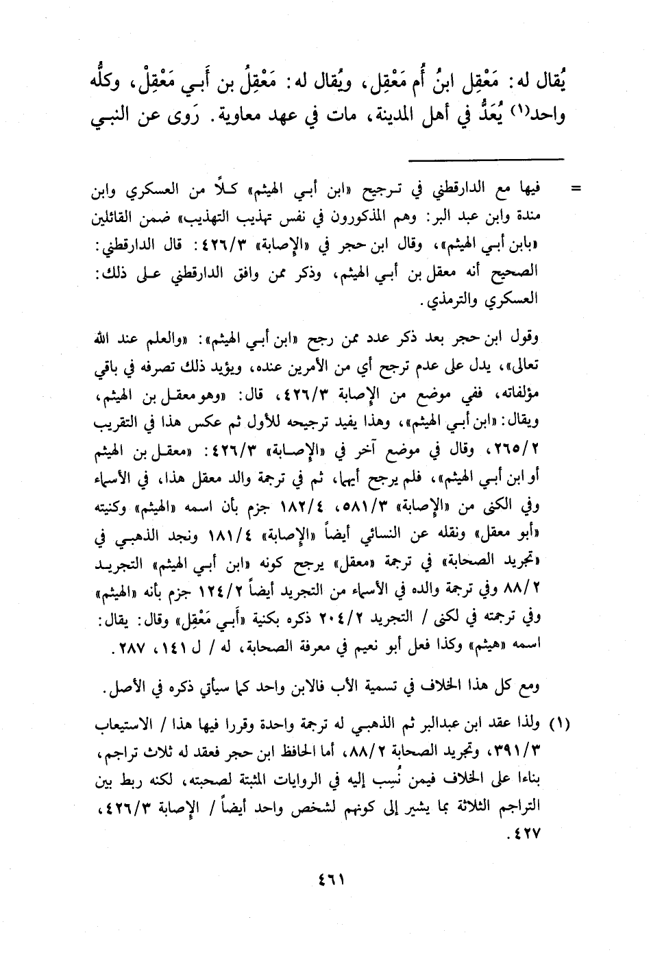 وقول ابن حجر بعد ذكر عدد ممن رجح "ابن أبي الهيثم": "والعلم عند الله تعالى"، يدل على عدم ترجح أي من الأمرين عنده، ويؤيد ذلك تصرفه في باقي مؤلفاته، ففي موضع من الإصابة 3/ 426، قال: "وهو معقل بن الهيثم، ويقال: "ابن أبي الهيثم"، وهذا يفيد ترجيحه للأول ثم عكس هذا في التقريب 2/ 265، وقال في موضع آخر في "الإصابة" 3/ 426: "معقل بن الهيثم أو ابن أبي الهيثم"، فلم يرجح أيهما، ثم في ترجمة والد معقل هذا، في الأسماء وفي الكنى من "الإصابة" 3/ 581، 4/ 182 جزم بأن اسمه "الهيثم" وكنيته "أبو معقل" ونقله عن النسائي أيضًا "الإصابة" 4/ 181 ونجد الذهبي في "تجريد الصحابة" في ترجمة "معقل" يرجح كونه "ابن أبي الهيثم" التجريد 2/ 88 وفي ترجمة والده في الأسماء من التجريد أيضًا 2/ 124 جزم بأنه "الهيثم " وفي ترجمته في الكنى/ التجريد 2/ 204 ذكره بكنية "أَبي مَعْقِل" وقال: يقال: اسمه "هيثم " وكذا فعل أبو نعيم في معرفة الصحابة، له/ ل 141، 287.