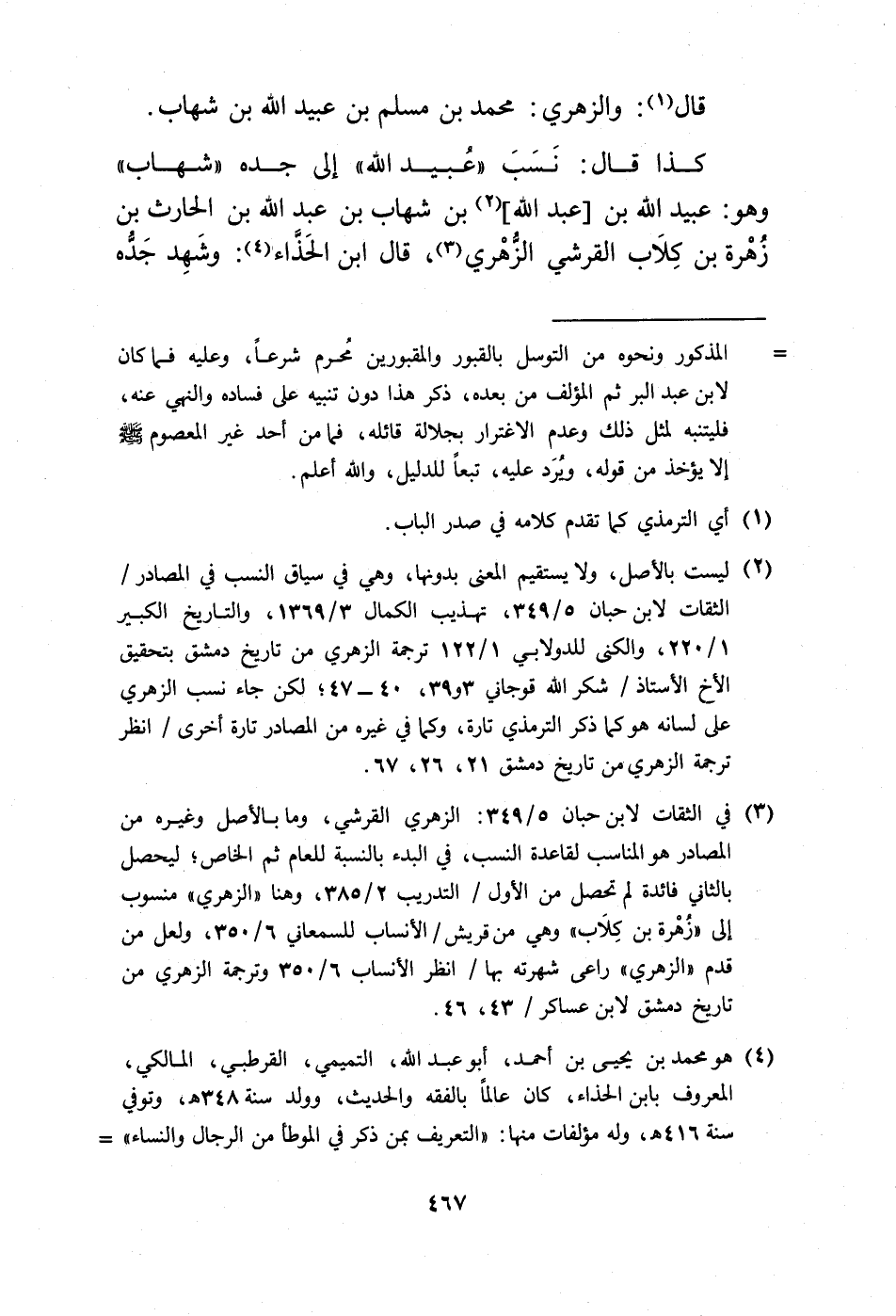 (¬2) ليست بالأصل، ولا يستقيم المعنى بدونها، وهي في سياق النسب في المصادر/ الثقات لابن حبان 5/ 349، تهذيب الكمال 3/ 1369، والتاريخ الكبير 1/ 220، والكنى للدولابي 1/ 122 ترجمة الزهري من تاريخ دمشق بتحقيق الأخ الأستاذ/ شكر الله قوجاني 3 و 39، 40 - 47؛ لكن جاء نسب الزهري على لسانه هو كما ذكر الترمذي تارة، وكما في غيره من المصادر تارة أخرى/ انظر ترجمة الزهري من تاريخ دمشق 21، 26، 67.