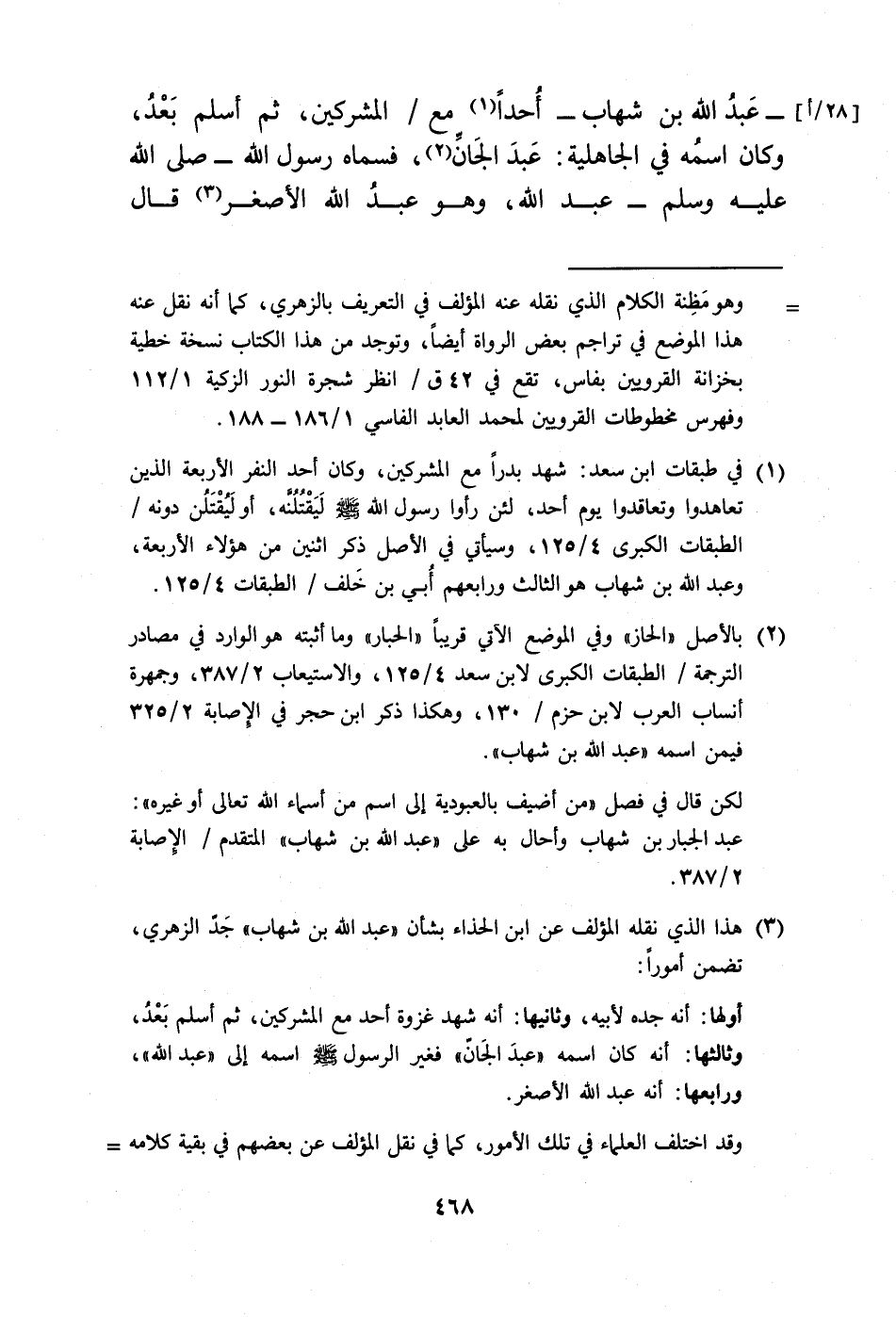 (¬1) في طبقات ابن سعد: شهد بدرًا مع المشركين، وكان أحد النفر الأربعة الذين تعاهدوا وتعاقدوا يوم أحد، لئن رأوا رسول الله -صلى الله عليه وسلم- لَيَقْتُلُنه، أو لَيُقْتَلُن دونه/ الطبقات الكبرى 4/ 125، وسيأتي في الأصل ذكر اثنين من هؤلاء الأربعة، وعبد الله بن شهاب هو الثالث ورابعهم أُبي بن خَلف/ الطبقات 4/ 125.