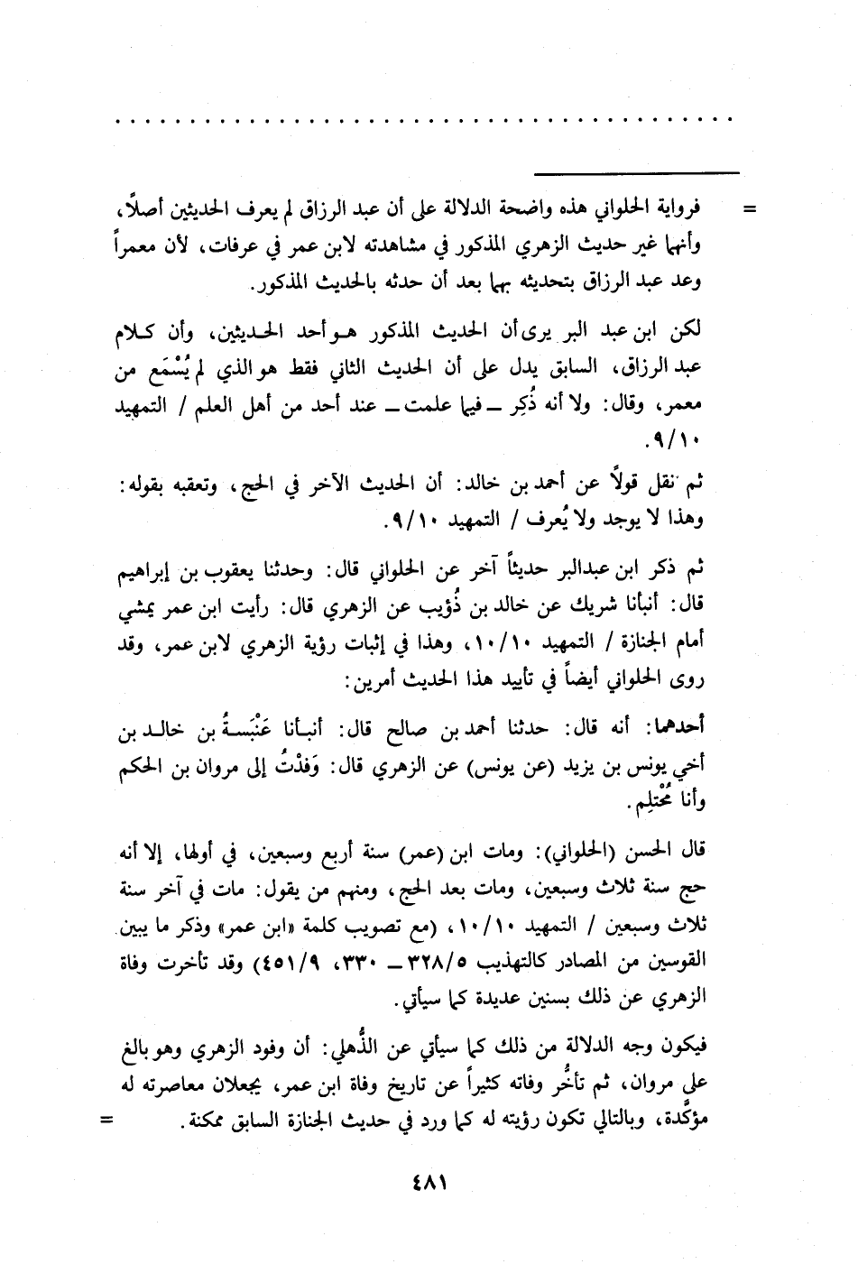 فيكون وجه الدلالة من ذلك كما سيأتي عن الذهلي: أن وفود الزهري وهو بالغ على مروان، ثم تأخُّر وفاته كثيرًا عن تاريخ وفاة ابن عمر، يجعلان معاصرته له مؤكَّدة، وبالتالي تكون رؤيته له كما ورد في حديث الجنازة السابق ممكنة. =
