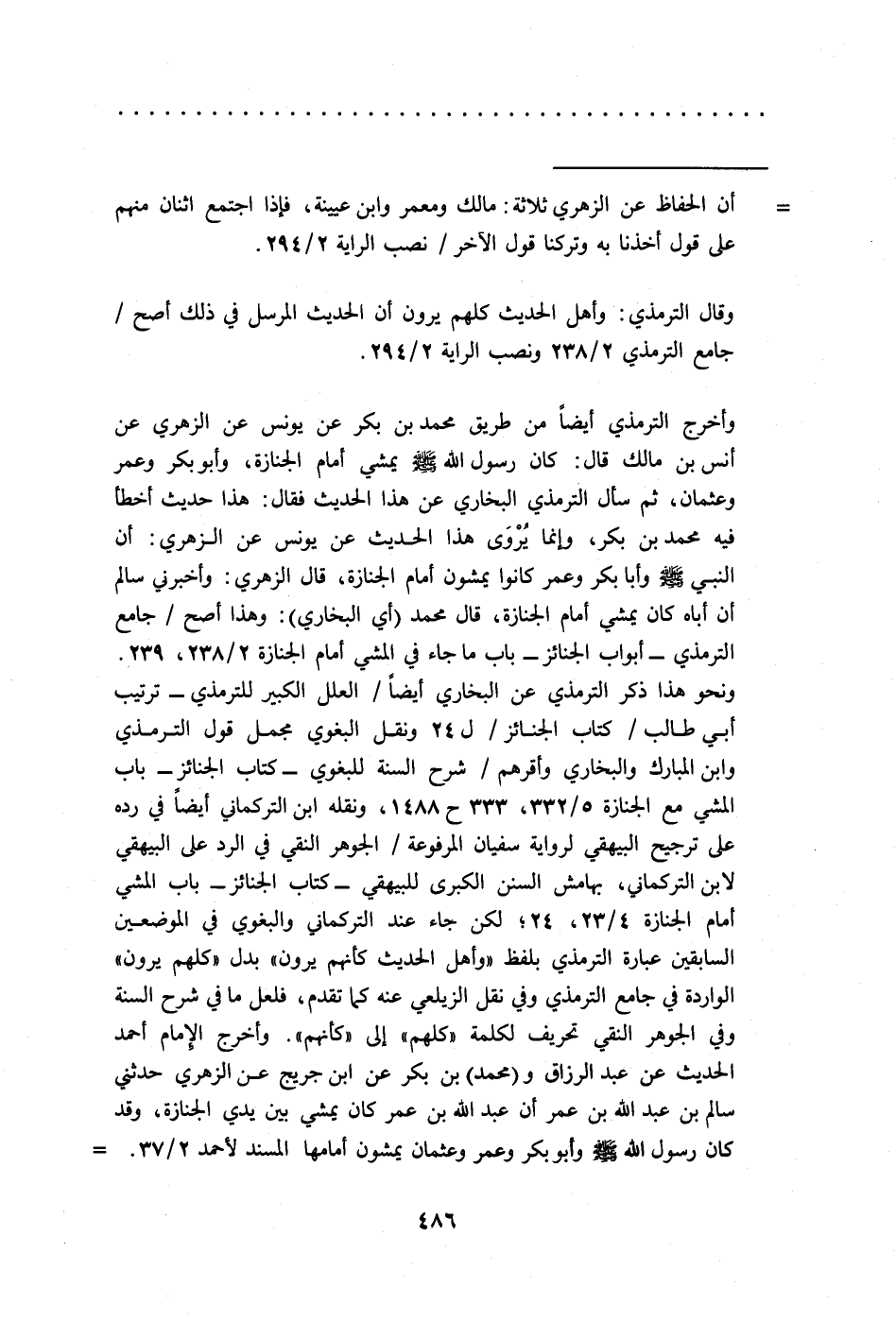 ونحو هذا ذكر الترمذي عن البخاري أيضًا/ العلل الكبير للترمذي - ترتيب أبي طالب/ كتاب الجنائز/ ل 24 ونقل البغوي مجمل قول الترمذي وابن المبارك والبخاري وأقرهم/ شرح السنة للبغوي - كتاب الجنائز - باب المشي مع الجنازة 5/ 332، 333 ح 1488، ونقله ابن التركماني أيضًا في رده على ترجيح البيهقي لرواية سفيان المرفوعة/ الجوهر النقي في الرد على البيهقي لابن التركماني، بهامش السنن الكبرى للبيهقي - كتاب الجنائز - باب المشي أمام الجنازة 4/ 23، 24؛ لكن جاء عند التركماني والبغوي في الموضعين السابقين عبارة الترمذي بلفظ "وأهل الحديث كأنهم يرون" بدل "كلهم يرون" الواردة في جامع الترمذي وفي نقل الزيلعي عنه كما تقدم، فلعل ما في شرح السنة وفي الجوهر النقي تحريف لكلمة "كلهم" إلى "كأنهم". وأخرج الإمام أحمد الحديث عن عبد الرزاق و (محمد) بن بكر عن ابن جريج عن الزهري حدثني سالم بن عبد الله بن عمر أن عبد الله بن عمر كان يمشي بين يدي الجنازة، وقد كان رسول الله -صلى الله عليه وسلم- وأبو بكر وعمر وعثمان يمشون أمامها المسند لأحمد 2/ 37. =