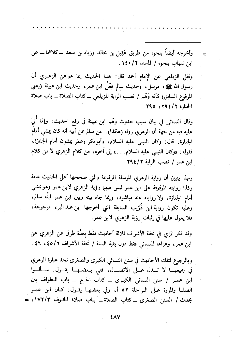 وقال النسائي في بيان سبب حدوث وَهْم ابن عيينة في رفع الحديث: وإنما أُتِيَ عليه فيه من جهة أن الزهري رواه (هكذا). عن سالم عن أبيه أنه كان يمشي أمام الجنازة، قال: وكان النبي عليه السلام، وأبو بكر وعمر يمشون أمام الجنازة، فقوله: "وكان النبي عليه السلام ... " إلى آخره، من كلام الزهري لا من كلام ابن عمر/ نصب الراية 2/ 294.