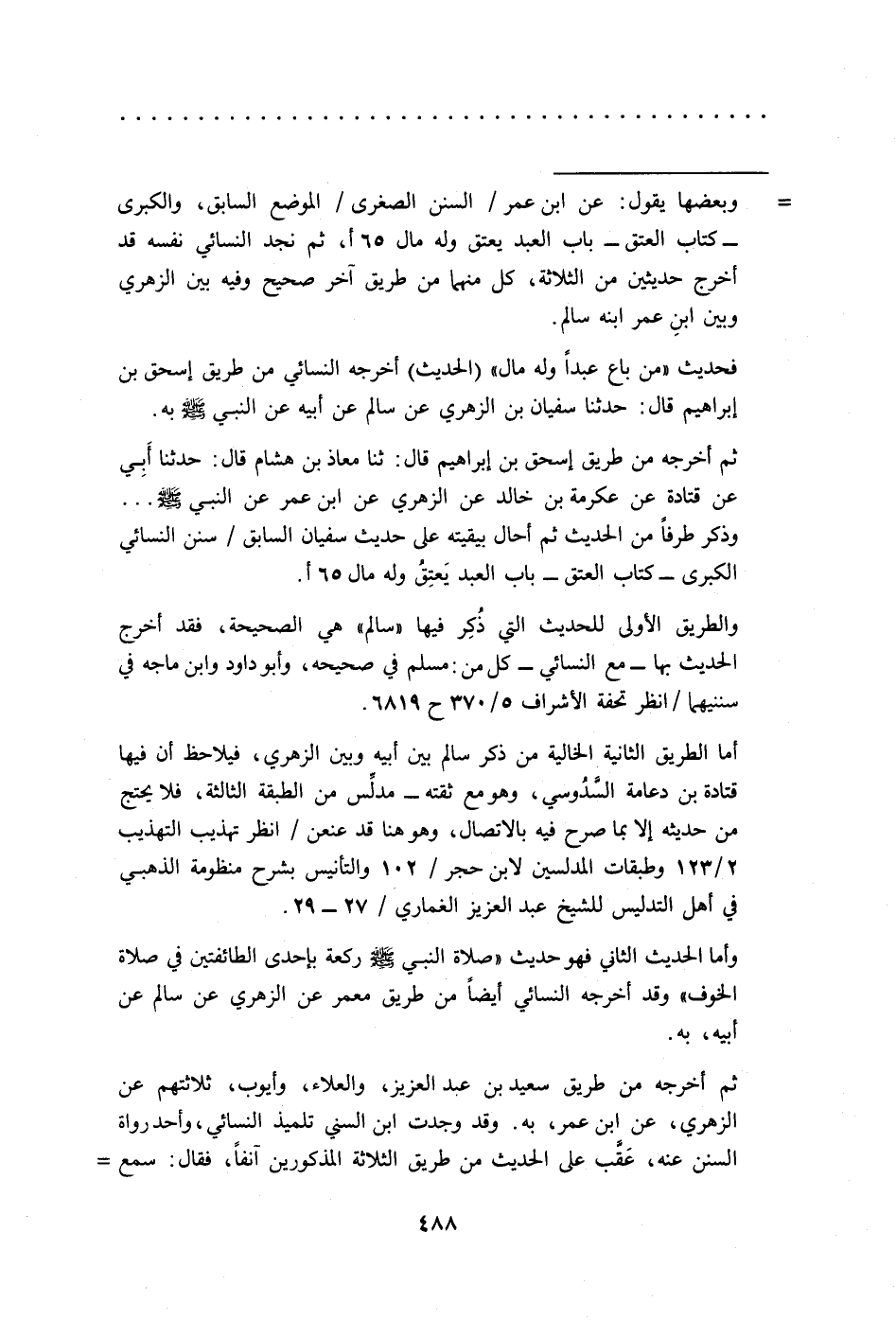 = وبعضها يقول: عن ابن عمر/ السنن الصغرى/ الموضع السابق، والكبرى - كتاب العتق - باب العبد يعتق وله مال 65 أ، ثم نجد النسائي نفسه قد أخرج حديثين من الثلاثة، كل منهما من طريق آخر صحيح وفيه بين الزهري وبين ابنِ عمر ابنه سالم.