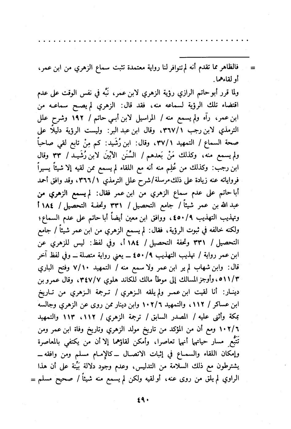 ولما قرر أبو حاتم الرازي رؤية الزهري لابن عمر، نَبَّه في نفس الوقت على عدم اقتضاء تلك الرؤية لسماعه منه، فقد قال: الزهري لم يصح سماعه من ابن عمر، رآه ولم يسمع منه/ المراسيل لابن أبي حاتم/ 192 وشرح علل الترمذي لابن رجب 1/ 367، وقال ابن عبد البر: وليست الرؤية دليلًا على صحة السماع/ التمهيد 1/ 37، وقال: ابن رُشَيد: كم مِنْ تابع لقي صاحبًا ولم يسمع منه، وكذلك مَنْ بَعدهم/ السَّنَن الأبْينَ لابن رُشَيد/ 33 وقال ابن رجب: وكذلك من عُلِم منه أنه مع اللقاء لم يسمع ممن لقيه إلا شيئًا يسيرًا فرواياته عنه زيادة على ذلك مرسلة/ شرح علل الترمذي 1/ 366، وقد وافق أحمد أبا حاتم على عدم سماع الزهري من ابن عمر فقال: لم يسمع الزهري من عبد الله بن عمر شيئًا/ جامع التحصيل/ 331 وتحفة التحصيل/ 184 أوتهذيب التهذيب 9/ 450، ووافق ابن معين أيضًا أبا حاتم على عدم السماع؛ ولكنه خالفه في ثبوت الرؤية، فقال: لم يسمع الزهري من ابن عمر شيئًا/ جامع التحصيل/ 331 وتحفة التحصيل/ 184 أ، وفي لفظ: ليس للزهري عن ابن عمر رواية/ تهذيب التهذيب 9/ 450 - يعني رواية متصلة- وفي لفظ آخر قال: وابن شهاب لم ير ابن عمر ولا سمع منه/ التمهيد 10/ 7 وفتح الباري 3/ 511، وأوجز المسالك الى موطأ مالك للكاند هلوي 7/ 347، وقال عمرو بن دينار: أنا لقيت ابن عمر ولم يلقه الزهري/ ترجمة الزهري من تاريخ ابن عساكر/ 112، والتمهيد 6/ 102 وابن دينار ممن روى عن الزهري وجالسه بمكة وأثنى عليه/ المصدر السابق/ ترجمة الزهري/ 112، 113 والتمهيد 6/ 102 ومع أن من المؤكد من تاريخ مولد الزهري وتاريخ وفاة ابن عمر ومن تَتَبُّعِ مسار حياتهما أنهما تعاصرا، وأمكن لقاؤهما إلا أن من يكتفي بالمعاصرة وإمكان اللقاء والسماع في إثبات الاتصال -كالإِمام مسلم ومن وافقه- يشترطون مع ذلك السلامة من التدليس، وعدم وجود دلالة بَيِّنة على أن هذا الراوي لم يلق من روى عنه، أو لقيه ولكن لم يسمع منه شيئًا/ صحيح مسلم =