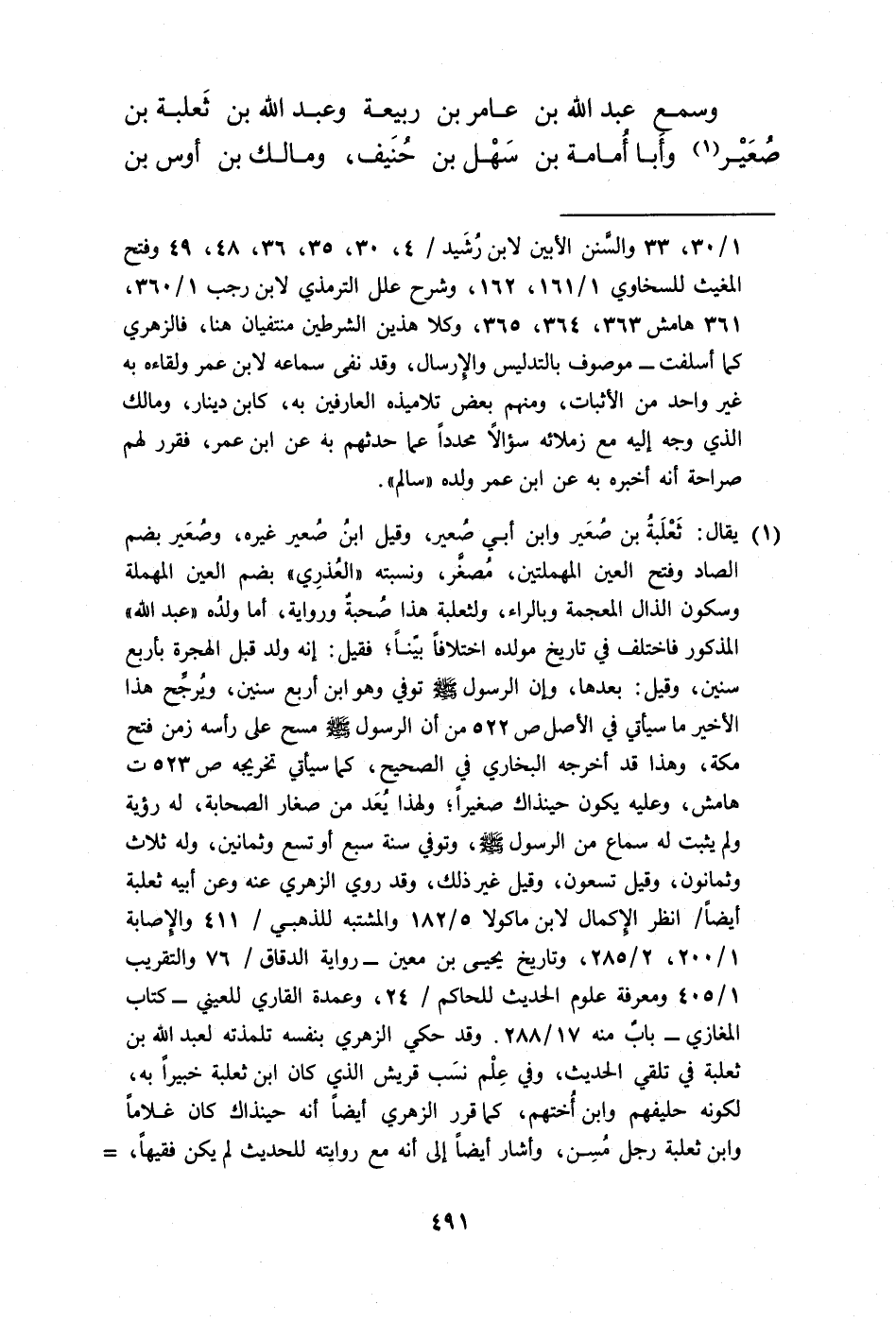 (¬1) يقال: ثَعْلَبةُ بن صُعَير وابن أبي صُعير، وقيل ابنُ صُعير غيره، وصُعَير بضم الصاد وفتح العين المهملتين، مُصغَّر، ونسبته "العُذرِي" بضم العين المهملة وسكون الذال المعجمة وبالراء، ولثعلبة هذا صُحبةُ ورواية، أما ولدُه "عبد الله" المذكور فاختلف في تاريخ مولده اختلافًا بيَّنًا؛ فقيل: إنه ولد قبل الهجرة بأربع سنين، وقيل: بعدها، وإن الرسول -صلى الله عليه وسلم- توفي وهو ابن أربع سنين، ويُرجِّح هذا الأخير ما سيأتي في الأصل ص 522 من أن الرسول -صلى الله عليه وسلم- مسح على رأسه زمن فتح مكة، وهذا قد أخرجه البخاري في الصحيح، كما سيأتي تخريجه ص 523 ت هامش، وعليه يكون حينذاك صغيرًا؛ ولهذا يُعَد من صغار الصحابة، له رؤية ولم يثبت له سماع من الرسول -صلى الله عليه وسلم-، وتوفي سنة سبع أو تسع وثمانين، وله ثلاث وثمانون، وقيل تسعون، وقيل غير ذلك، وقد روي الزهري عنه وعن أبيه ثعلبة أيضًا/ انظر الإِكمال لابن ماكولا 5/ 182 والمشتبه للذهبي/ 411 والإصابة 1/ 200، 2/ 285، وتاريخ يحيى بن معين - رواية الدقاق/ 76 والتقريب 1/ 405 ومعرفة علوم الحديث للحاكم/ 24، وعمدة القاري للعيني - كتاب المغازي - بابٌ منه 17/ 288. وقد حكي الزهري بنفسه تلمذته لعبد الله بن ثعلبة في تلقي الحديث، وفي عِلْم نسَب قريش الذي كان ابن ثعلبة خبيرًا به، لكونه حليفهم وابن أُختهم، كما قرر الزهري أيضًا أنه حينذاك كان غلامًا وابن ثعلبة رجل مُسِن، وأشار أيضًا إلى أنه مع روايته للحديث لم يكن فقيهًا، =