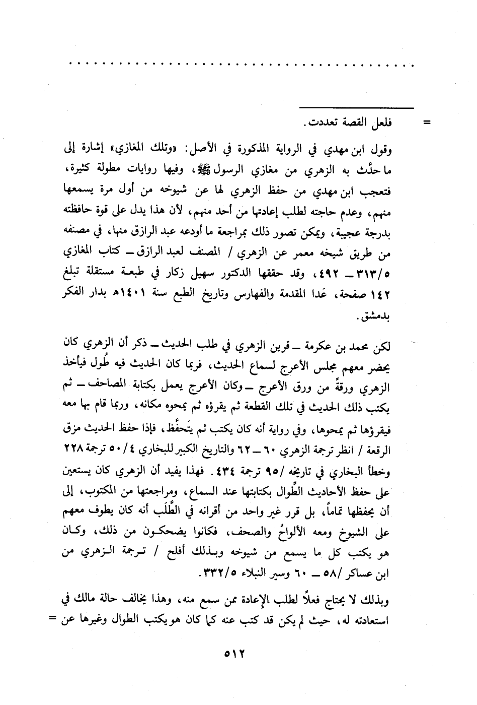 وقول ابن مهدي في الرواية المذكورة في الأصل: "وتلك المغازي" إشارة إلى ما حدَّث به الزهري من مغازي الرسول -صلى الله عليه وسلم-، وفيها روايات مطولة كثيرة، فتعجب ابن مهدي من حفظ الزهري لها عن شيوخه من أول مرة يسمعها منهم، وعدم حاجته لطلب إعادتها من أحد منهم، لأن هذا يدل على قوة حافظته بدرجة عجيبة، ويمكن تصور ذلك بمراجعة ما أودعه عبد الرازق منها، في مصنفه من طريق شيخه معمر عن الزهري/ المصنف لعبد الرازق - كتاب المغازي 5/ 313 - 492، وقد حققها الدكتور سهيل زكار في طبعة مستقلة تبلغ 142 صفحة، عَدا المقدمة والفهارس وتاريخ الطبع سنة 1401 هـ بدار الفكر بدمشق.