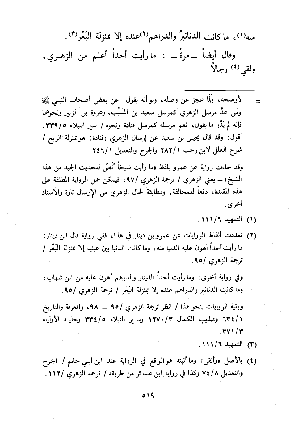 وفي رواية أخرى: وما رأيت أحدًا الدينار والدرهم أهون عليه من ابن شهاب، وما كانت الدنانير والدراهم عنده إلا بمنزلة البَعْر/ ترجمة الزهري/ 95.