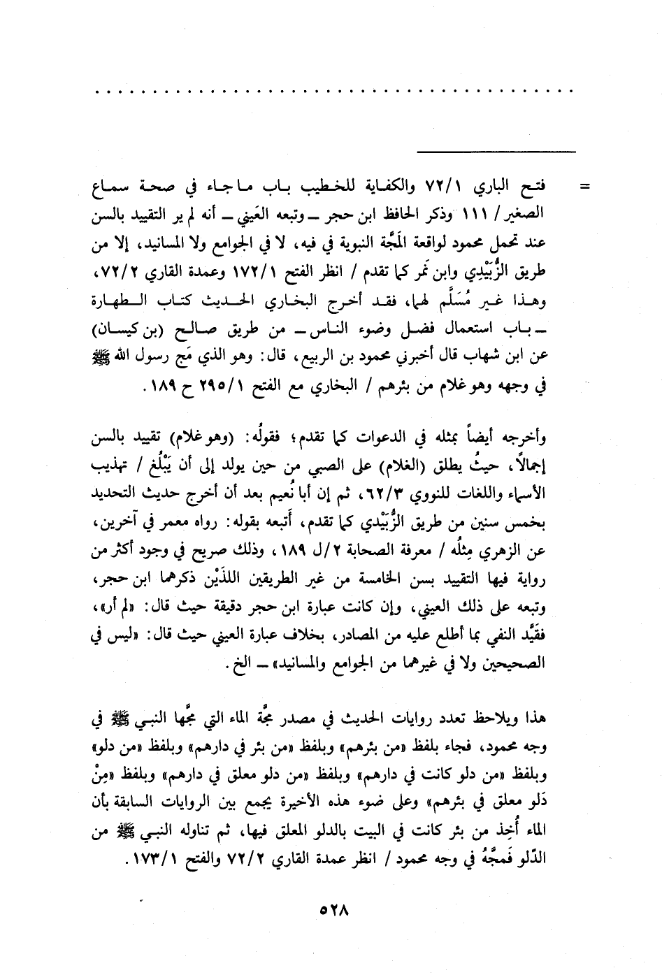 = فتح الباري 1/ 72 والكفاية للخطيب باب ما جاء في صحة سماع الصغير/ 111 وذكر الحافظ ابن حجر -وتبعه العَيني- أنه لم ير التقييد بالسن عند تحمل محمود لواقعة المَجَّة النبوية في فيه، لا في الجوامع ولا المسانيد، إلا من طريق الزُّبَيْدِي وابن نَمر كما تقدم/ انظر الفتح 1/ 172 وعمدة القاري 2/ 72، وهذا غير مُسَلَّم لهما، فقد أخرج البخاري الحديث كتاب الطهارة -باب استعمال فضل وضوء الناس- من طريق صالح (بن كيسان) عن ابن شهاب قال أخبرني محمود بن الربيع، قال: وهو الذي مَج رسول الله -صلى الله عليه وسلم- في وجهه وهو غلام من بئرهم/ البخاري مع الفتح 1/ 295 ح 189.