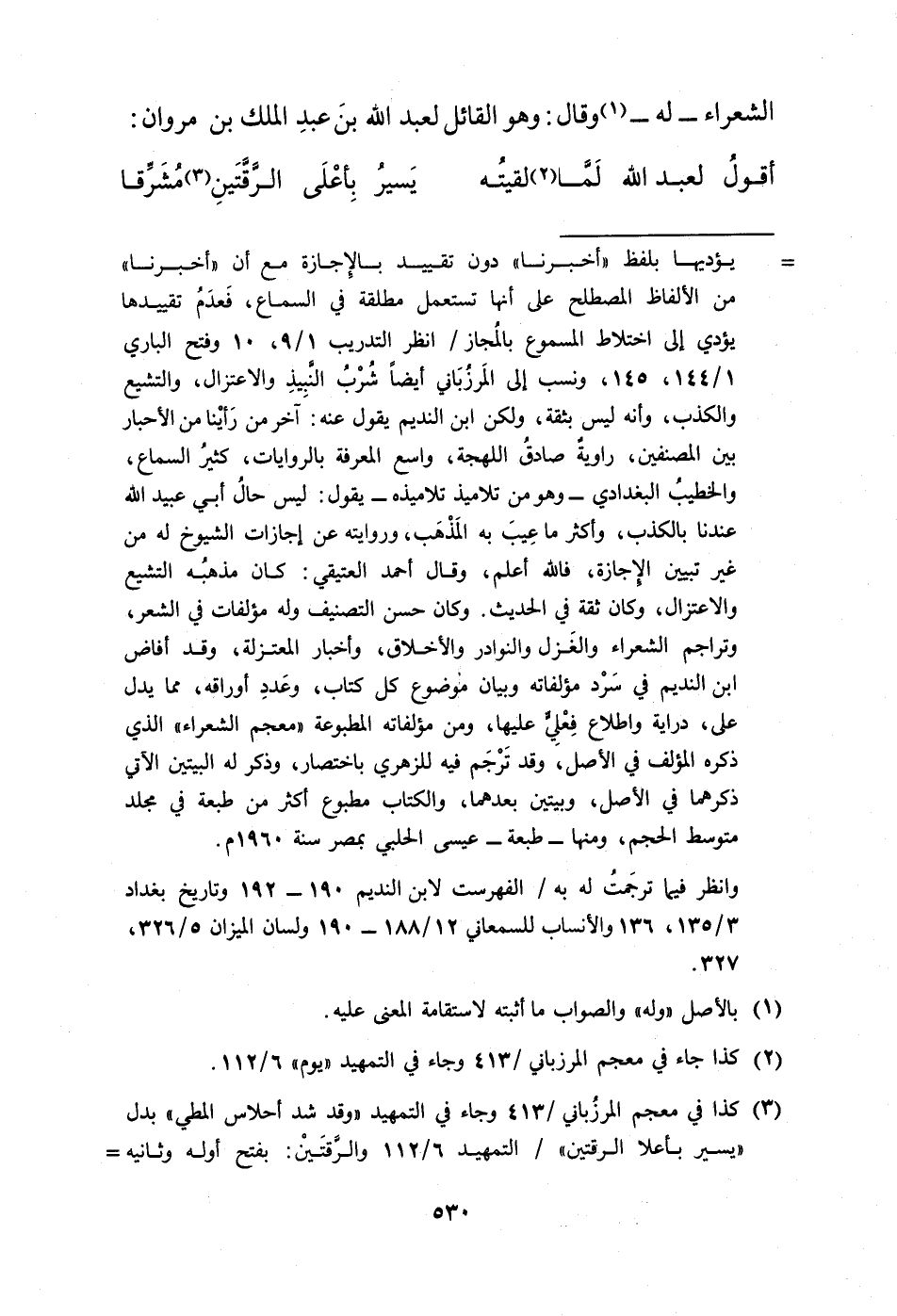 = يؤديها بلفظ "أخبرنا" دون تقييد بالإِجازة مع أن "أخبرنا" من الألفاظ المصطلح على أنها تستعمل مطلقة في السماع، فَعدَمُ تقييدها يؤدي إلى اختلاط المسموع بالمُجاز/ انظر التدريب 1/ 9، 10 وفتح الباري 1/ 144، 145، ونسب إلى المَرزُبَاني أيضًا شُرْبُ النِّبِيذِ والاعتزال، والتشيع والكذب، وأنه ليس بثقة، ولكن ابن النديم يقول عنه: آخر من رَأيْنا من الأحبار بين المصنفين، راويةٌ صادقُ اللهجة، واسع المعرفة بالروايات، كثيرُ السماع، والخطيبُ البغدادي -وهو من تلاميذ تلاميذه- يقول: ليس حالُ أبي عبيد الله عندنا بالكذب، وأكثر ما عِيبَ به المَذْهَب، وروايته عن إجازات الشيوخ له من غير تبيين الإجازة، فالله أعلم، وقال أحمد العتيقي: كان مذهبُه التشيع والاعتزال، وكان ثقة في الحديث. وكان حسن التصنيف وله مؤلفات في الشعر، وتراجم الشعراء والغَزل والنوادر والأخلاق، وأخبار المعتزلة، وقد أفاض ابن النديم في سَرْد مؤلفاته وبيان موضوع كل كتاب، وعَددِ أوراقه، مما يدل على، دراية واطلاع فِعْلِيِّ عليها، ومن مؤلفاته المطبوعة "معجم الشعراء" الذي ذكره المؤلف في الأصل، وقد تَرْجَم فيه للزهري باختصار، وذكر له البيتين الآتي ذكرهما في الأصل، وبيتين بعدهما، والكتاب مطبوع أكثر من طبعة في مجلد متوسط الحجم، ومنها -طبعة- عيسى الحلبي بمصر سنة 1960 م.