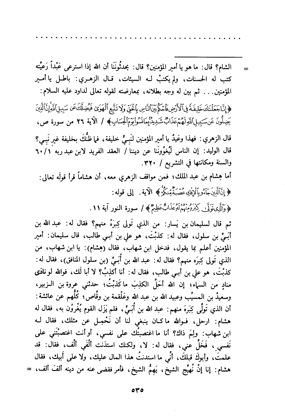ثم قال لسليمان بن يَسار: من الذي تَولى كِبرَهُ منهم؟ فقال له: عبد الله بن أبَيِّ بن سلول، فقال له: كذبْتَ، هو علي بن أبي طالب، قال سليمان: أمير المؤمنين أعلم بما يقول، فدخل ابن شهاب، فقال (هِشام): يا ابن شهاب، من الذي تَولى كِبرَه منهم؟ فقال له: عبد الله بن أُبَيِّ (بن سلول المنافق)، فقال له: كذبْتَ، هو علي بن أبي طالب، فقال له: أنا أكذِبُ؟ لا أبا لَك، فوالله لو نادَى منادٍ من السماء؛ إن الله أحَلَّ الكذِبَ ما كَذبْتُ؛ حدثني عروة بن الزبير، وسعيدُ بن المسيِّب وعبيد الله بن عبد الله وعَلْقمة بن وقاص؛ كُلُّهم عن عائشة: أن الذي تَولَّى كِبَرهَ منهم: عبد الله بن أُبَيِّ، فلم يَزَل القوم يُغْروُن به، فقال له هشام: ارحل، فوالله ما كان ينبغي لنا أن نَحْمِل عن مثلك، فقال له ابن شهاب: ولِمَ ذاك؟ أنا ما أغتصبتُك على نفسي، أو أنت اغتصبْتَني على نَفسيِ، فَخَلِّ عني، فقال له: لا، ولكنك استدَنت ألْفَي ألْف، فقال: قد علمتَ، وأبوكَ قبلكَ، أنِّي ما استدنتُ هذا المال عليك، ولا على أَبيك، فقال هشام: إنا إنْ نُهيِّج الشيخ، يَهِمُّ الشيخ، فأمر فقضى عنه من دينه ألفَ ألف، =