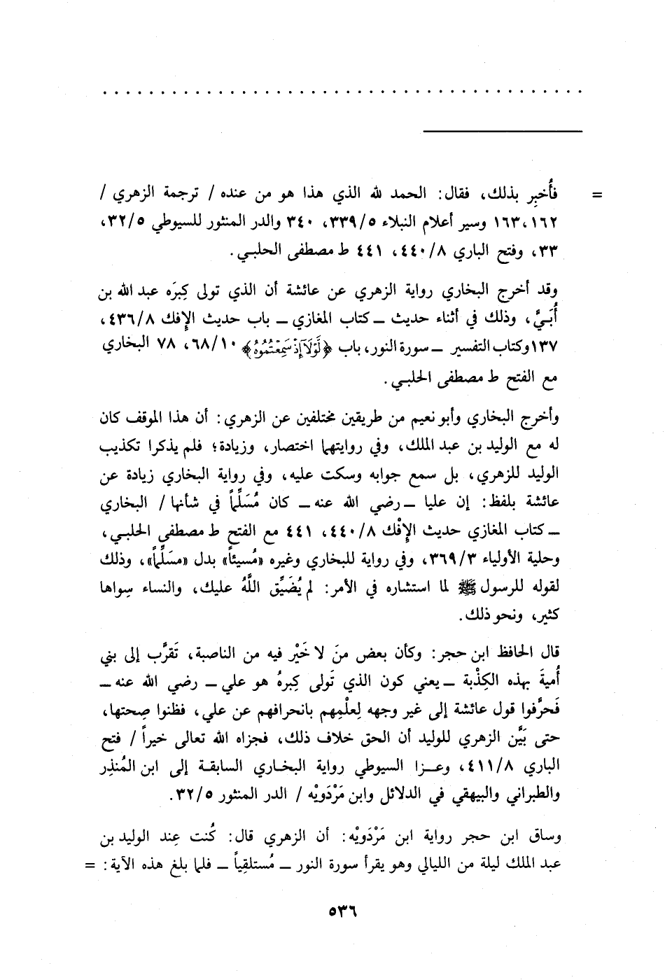 وساق ابن حجر رواية ابن مَرْدَويْه: أن الزهري قال: كُنت عِند الوليد بن عبد الملك ليلة من الليالي وهو يقرأ سورة النور -مُستلقِيًا- فلما بلغ هذه الآية: =