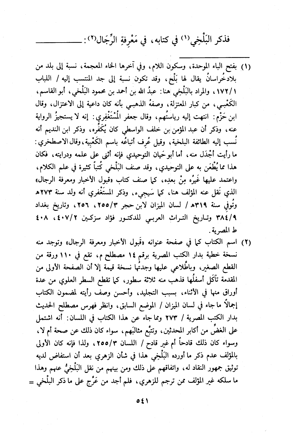 (¬1) بفتح الباء الموحدة، وسكون اللام، وفي آخرها الخاء المعجمة، نسبة إلى بلد من بلاد خُراسانُ يقال لها بَلْح، وقد تكون نسبة إلى جد المنتسب إليه/ اللباب 1/ 172، والمراد بالبَلْخِي هنا: عبدُ الله بن أحمد بن محمود البَلْخي، أبو القاسم، الكَعْبي، من كبار المعتزلة، وصفهُ الذهبي بأنه كان داعية إلى الاعتزال، وقال ابن حَزْم: انتهت إليه رياستُهم، وقال جعفر المُسْتَغْفِري: إنه لا يستجيزُ الرواية عنه، وذكر أن عبد المؤمن بن خلف الواسطي كان يُكَفِّره، وذكر ابن النديم أنه نُسب إليه الطائفة البلخية، وقيل عُرِف أتباعُه باسم الكَعْبِية، وقال الاصطخري: ما رأيت أجْدَل منه، إما أبو حَيان التوحيدي فإنه أثنى على علمه ودرايته، فكان هذا مما يُطْعَن به على التوحيدي، وقد صنف البَلْخي كُتبًا كثيرة في علم الكلام، واعتمد عليها غَيرُه مِنْ بعدِه، كما صنف كتاب "قبول الأخبار ومعرفة الرجال" الذي نَقل عنه المؤلف هنا، كما سَيجِيء، وذكر المستَغْفري أنه ولد سنة 273 هـ وتُوفِي سنة 319 هـ/ لسان الميزان لابن حجر 3/ 255، 256، وتاريخ بغداد 9/ 384 وتاريخ التراث العربي للدكتور فؤاد سزكين 2/ 407، 408 ط المصرية.