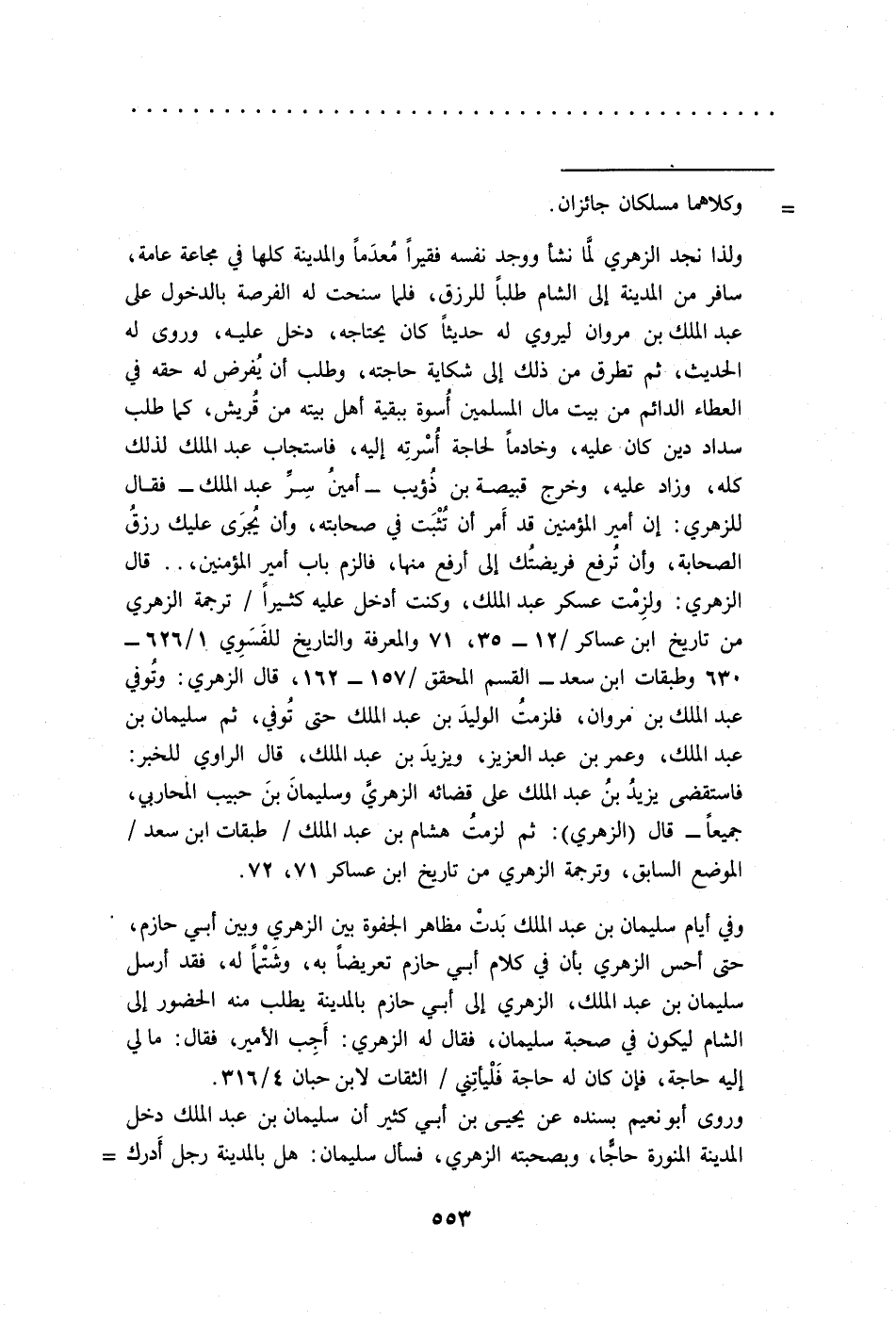 ولذا نجد الزهري لمَّا نشأ ووجد نفسه فقيرًا معدَمًا والمدينة كلها في مجاعة عامة، سافر من المدينة إلى الشام طلبًا للرزق، فلما سنحت له الفرصة بالدخول على عبد الملك بن مروان ليروي له حديثًا كان يحتاجه، دخل عليه، وروى له الحديث، ثم تطرق من ذلك إلى شكاية حاجته، وطلب أن يفرض له حقه في العطاء الدائم من بيت مال المسلمين أسوة ببقية أهل بيته من قُريش، كما طلب سداد دين كان عليه، وخادمًا لحاجة أسْرتِه إليه، فاستجاب عبد الملك لذلك كله، وزاد عليه، وخرج قبيصة بن ذُؤيب -أمينُ سِرِّ عبد الملك- فقال للزهري: إن أمير المؤمنين قد أَمر أن تُثْبَت في صحابته، وأن يُجرَى عليك رزقُ الصحابة، وأن تُرفع فريضتك إلى أرفع منها، فالزم باب أمير المؤمنين، .. قال الزهري: ولزِمْت عسكر عبد الملك، وكنت أدخل عليه كثيرًا/ ترجمة الزهري من تاريخ ابن عساكر 12 / - 35، 71 والمعرفة والتاريخ للفَسَوِي 1/ 626 - 630 وطبقات ابن سعد - القسم المحقق / 157 - 162، قال الزهري: وتُوفي عبد الملك بنْ مروان، فلزمتُ الوليدَ بن عبد الملك حتى تُوفي، ثم سليمان بن عبد الملك، وعمر بن عبد العزيز، ويزيدَ بن عبد الملك، قال الراوي للخبر: فاستقضى يزيدُ بنُ عبد الملك على قضائه الزهري وسليمانَ بنَ حبيب المحاربي، جميعًا - قال (الزهري): ثم لزمتُ هشام بن عبد الملك/ طبقات ابن سعد/ الموضع السابق، وترجمة الزهري من تاريخ ابن عساكر 71، 72.