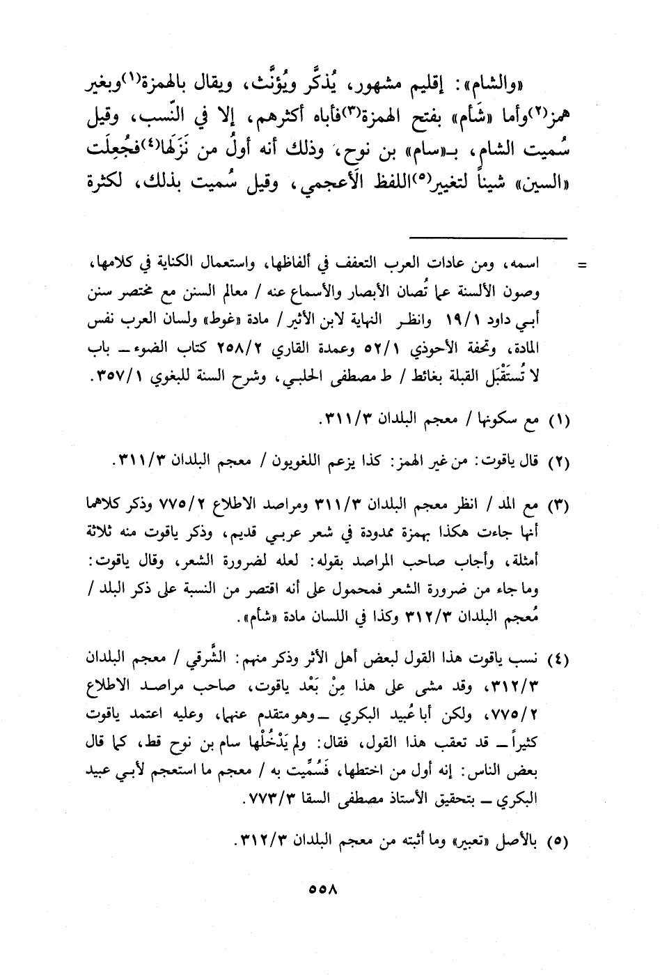 (¬3) مع المد/ انظر معجم البلدان 3/ 311 ومراصد الاطلاع 2/ 775 وذكر كلاهما أنها جاءت هكذا بهمزة ممدودة في شعر عربي قديم، وذكر ياقوت منه ثلاثة أمثلة، وأجاب صاحب المراصد بقوله: لعله لضرورة الشعر، وقال ياقوت: وما جاء من ضرورة الشعر فمحمول على أنه اقتصر من النسبة على ذكر البلد/ مُعجم البلدان 3/ 312 وكذا في اللسان مادة "شأم".