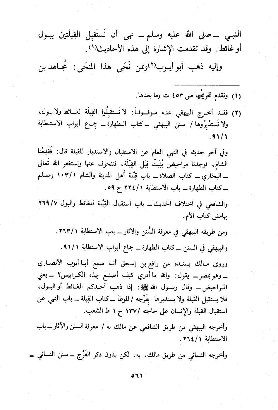 وفي آخر حديثه في النهي العام عن الاستقبال والاستدبار للقبلة قال: فَقدِمْنا الشامَ، فوجدنا مراحيض بُنِيَتْ قِبَل القِبْلَة، فننحرف عنها ونستغفر الله تَعالى - البخاري - كتاب الصلاة - باب قِبْلة أَهل المدينة والشام 1/ 103 ومسلم - كتاب الطهارة - باب الاستطابة 1/ 224 ح 59.