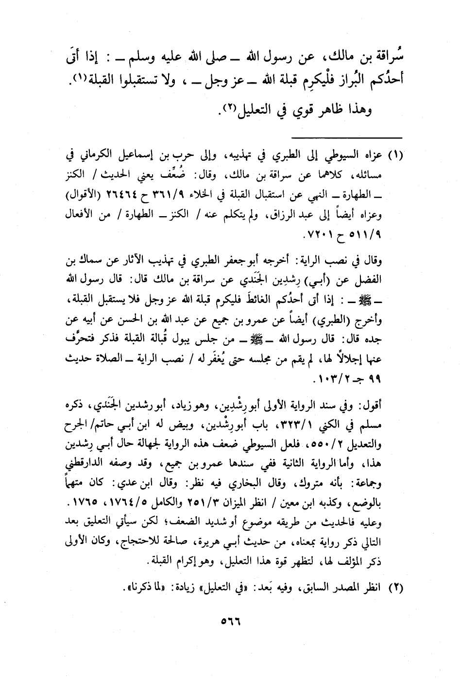 وقال في نصب الراية: أخرجه أبو جعفر الطبري في تهذيب الآثار عن سماك بن الفضل عن (أبي) رِشدِين الجَنَدي عن سراقة بن مالك قال: قال رسول الله -صلى الله عليه وسلم-: إذا أتى أحدُكم الغائطَ فليكرم قبلة الله عز وجل فلا يستقبل القبلة، وأخرج (الطبري) أيضًا عن عمرو بن جميع عن عبد الله بن الحسن عن أبيه عن جده قال: قال رسول الله -صلى الله عليه وسلم- من جلس يبول قُبالة القبلة فذكر فتحرَّف عنها إجلالًا لها، لم يقم من مجلسه حتى يُغفَر له/ نصب الراية - الصلاة حديث 99 جـ 2/ 103.