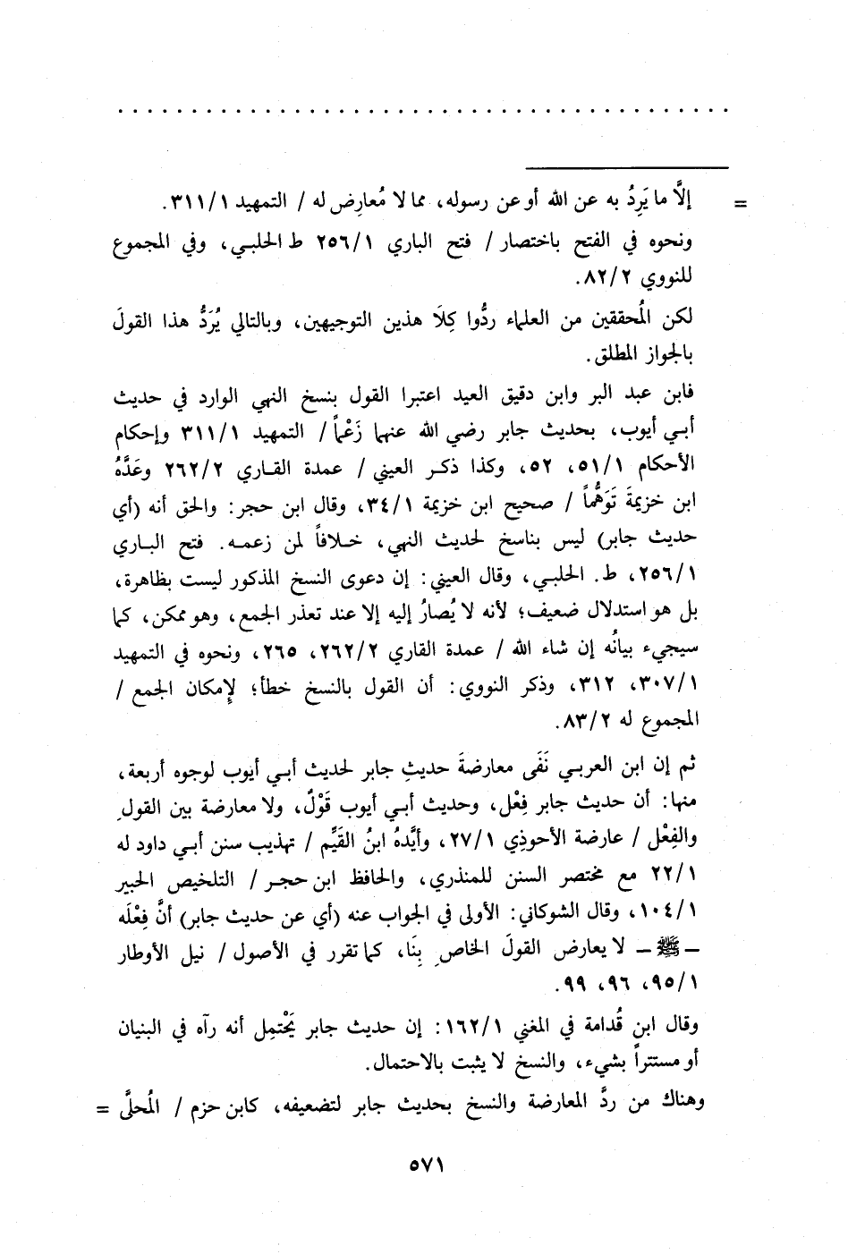 وقال ابن قُدامة في المغني 1/ 162: إن حديث جابر يَحْتمِل أنه رآه في البنيان أو مستترًا بشيء، والنسخ لا يثبت بالاحتمال.
