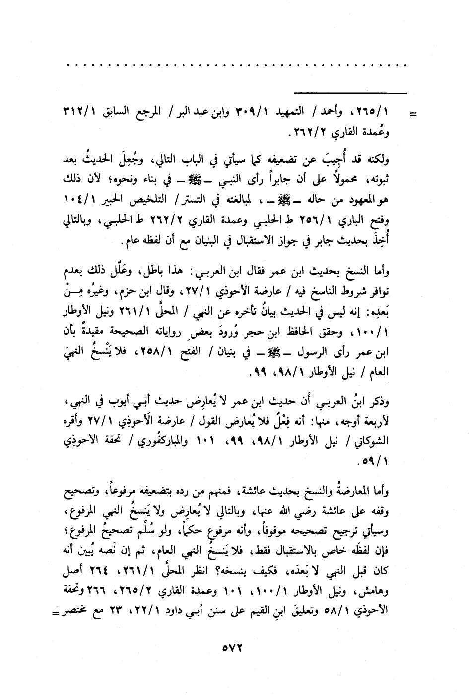 وأما النسخ بحديث ابن عمر فقال ابن العربي: هذا باطل، وعَلَّل ذلك بعدم توافر شروط الناسخ فيه/ عارضة الأحوذي 1/ 27، وقال ابن حزم، وغيرُه مِنْ بَعدِه: إنه ليس في الحديث بيانُ تأخره عن النهي/ المحلَّى 1/ 261 ونيل الأوطار 1/ 100، وحقق الحافظ ابن حجر وُرودَ بعضِ رواياته الصحيحة مقيدةً بأن ابن عمر رأى الرسول -صلى الله عليه وسلم- في بنيان/ الفتح 1/ 258، فلا يَنْسخُ النهيَ العام/ نيل الأوطار 1/ 98، 99.