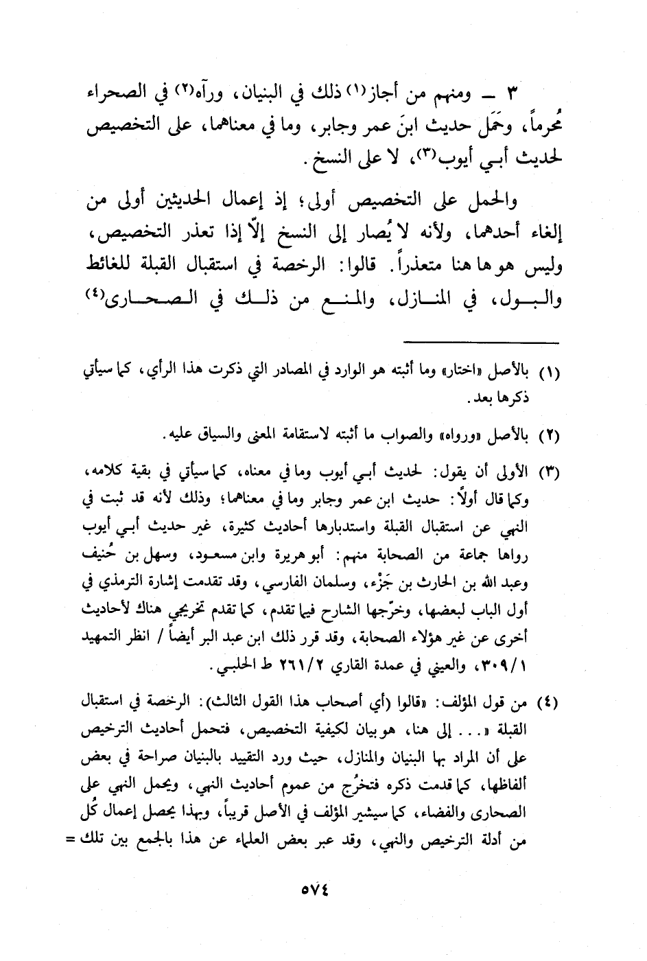 والحمل على التخصيص أولى؛ إذ إعمال الحديثين أولى من إلغاء أحدهما، ولأنه لا يُصار إلى النسخ إلّا إذا تعذر التخصيص، وليس هو هاهنا متعذرًا. قالوا: الرخصة في استقبال القبلة للغائط والبول، في المنازل، والمنع من ذلك في الصحارى (¬4)