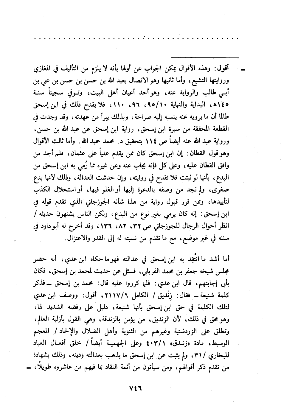 = أقول: وهذه الأقوال يمكن الجواب عن أولها بأنه لا يلزم من التأليف في المغازي وروايتها التشيع، وأما ثانيها وهو الاتصال بعبد الله بن حسن بن حسن بن علي بن أبي طالب والرواية عنه، وهو أحد أعيان أهل البيت، وتوفي سجينًا سنة 145 هـ، البداية والنهاية 10/ 95، 96، 110، فلا يقدح ذلك في ابن إسحق طالما أن ما يرويه عنه ينسبه إليه صراحة، وبذلك يبرأ من عهدته، وقد وجدت في القطعة المحققة من سيرة ابن إسحق، رواية ابن إسحق عن عبد الله بن حسن، ورواية عبد الله عنه أيضًا ص 114 بتحقيق د. محمد حميد الله. وأما ثالث الأقوال وهو قول القطان: إن ابن إسحق كان ممن يقدم عليًا على عثمان، فلم أجد من وافق القطان عليه، وعلى كل فإنه يجاب عنه وعن غيره مما رُمي به ابن إسحق من البدع، بأنها لو ثبتت فلا تقدح في روايته، وإن خدشت العدالة، وذلك لأنها بدع صغرى، ولم نجد من وصفه بالدعوة إليها أو الغلو فيها، أو استحلال الكذب لتأييدها، وممن قرر قبول رواية من هذا شأنه الجوزجاني الذي تقدم قوله في ابن إسحق: إنه كان يرمي بغير نوع من البدع، ولكن الناس يشتهون حديثه/ انظر أحوال الرجال للجوزجاني ص 32، 82، 136، وقد أخرج له أبو داود في سننه في غير موضع، مع ما تقدم من نسبته له إلى القدر والاعتزال.