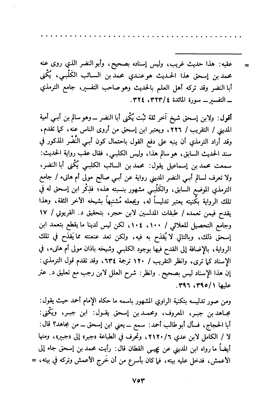أقول: ولابن إسحق شيخ آخر ثقة ثبْت يُكْنى أبا النضر - وهو سالم بن أبي أمية المديني/ التقريب/ 226، ويعتبر ابن إسحق من أروى الناس عنه، كما تقدم، وقد أراد الترمذي أن ينبه على دفع القول باحتمال كون أبي النَّضْر المذكور في سند الحديث السابق، هو سالم هذا، وليس الكلبي، فقال عقب رواية الحديث: سمعت محمد بن إسماعيل يقول: محمد بن السائب الكلبي يُكْنى أبا النضر، ولا تعرف لسالم أبي النضر المديني رواية عن أبي صالح مولى أم هانئ/ جامع الترمذي الموضع السابق، والكَلْبي مشهور بنسبته هذه؛ فذِكْر ابن إسحق له في تلك الرواية بكُنيته يعتبر تدليسًا له، ويجعله مُشتبِهًا بشيخه الآخر الثقة، وهذا يقدح فيمن تعمده/ طبقات المدلسين لابن حجر، بتحقيق د. القريوتي/ 17 وجامع التحصيل للعلائي/ 100، 154، لكن ليس لدينا ما يقطع بتعمد ابن إسحق ذلك، وبالتالي لا يُقدَح به فيه، ولكن تعد عنعنته مما يَقدَح في تلك الرواية، بالإضافة إلى القدح فيها بوجود الكلبي وشيخه باذان مولى أم هانئ، في الإسناد كما ترى، وانظر التقريب/ 125 ترجمة 634، وقد تقدم قول الترمذي: إن هذا الإسناد ليس بصحيح. وانظر: شرح العلل لابن رجب مع تعليق د. عتر عليها 1/ 395، 396.