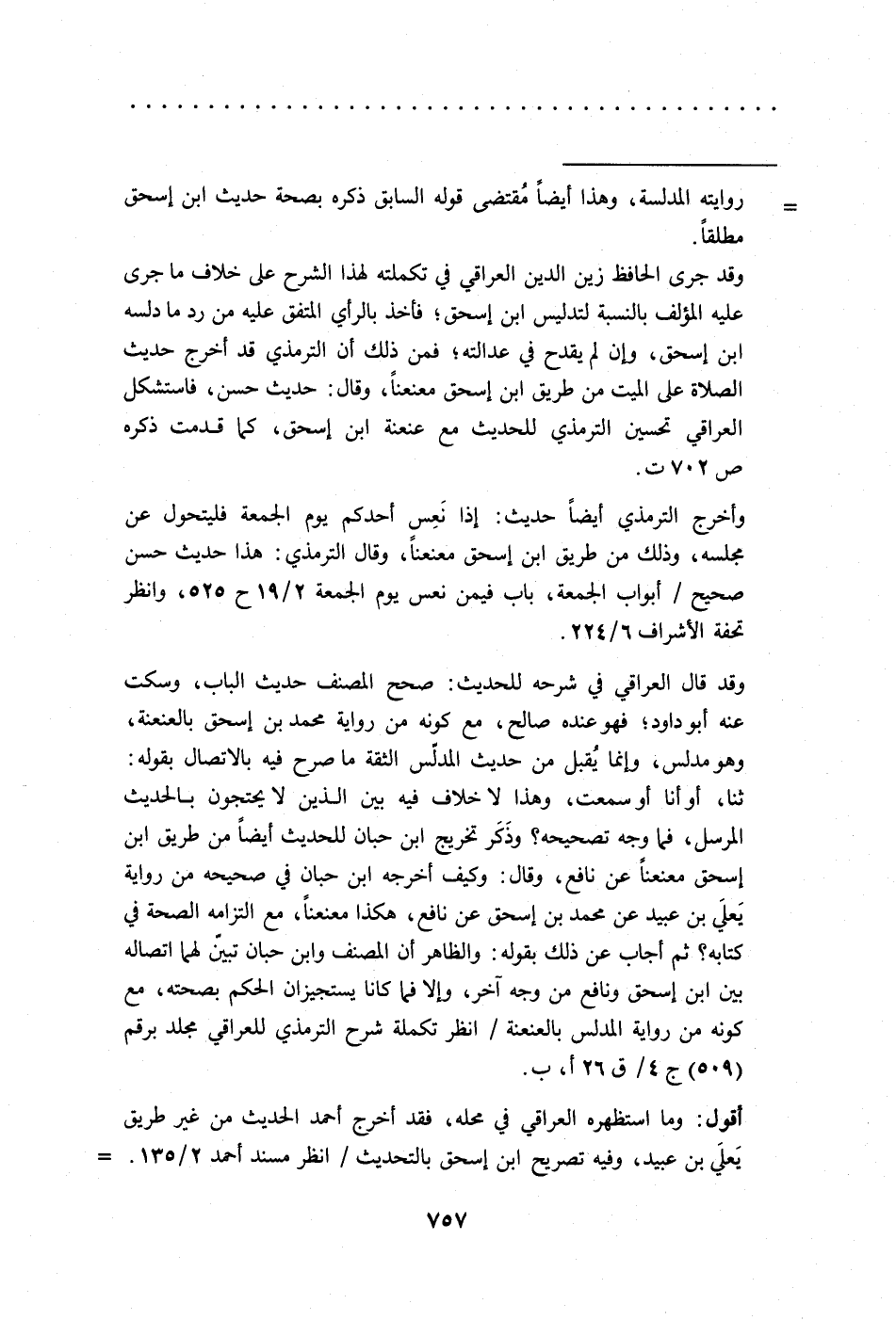 وقد جرى الحافظ زين الدين العراقي في تكملته لهذا الشرح على خلاف ما جرى عليه المؤلف بالنسبة لتدليس ابن إسحق؛ فأخذ بالرأي المتفق عليه من رد ما دلسه ابن إسحق، وإن لم يقدح في عدالته؛ فمن ذلك أن الترمذي قد أخرج حديث الصلاة على الميت من طريق ابن إسحق معنعنًا، وقال: حديث حسن، فاستشكل العراقي تحسين الترمذي للحديث مع عنعنة ابن إسحق، كما قدمت ذكره ص 702 ت.