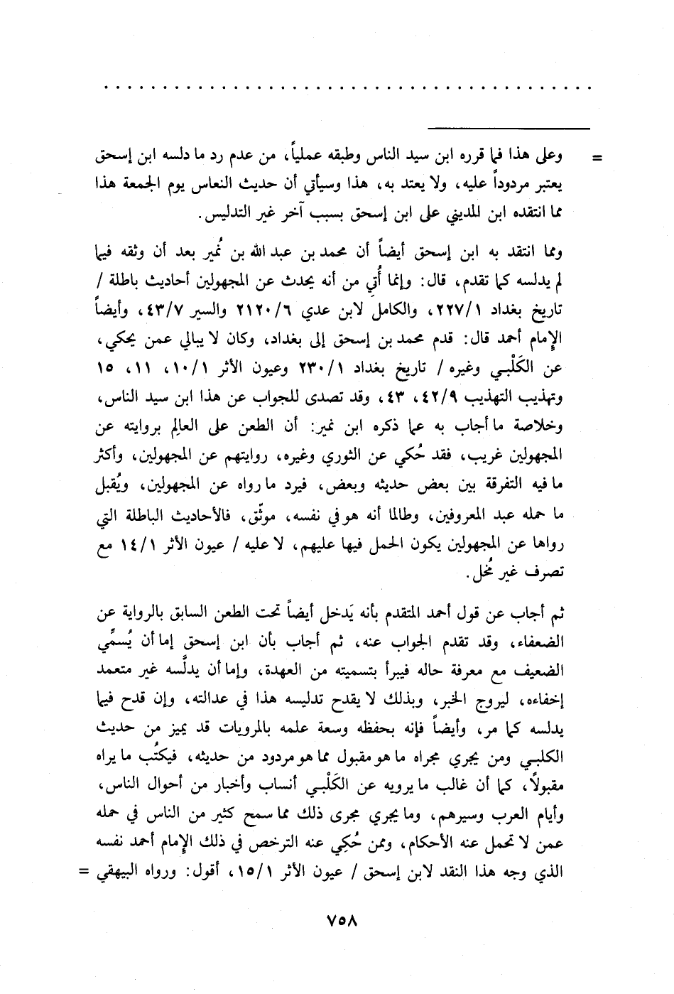= وعلى هذا فما قرره ابن سيد الناس وطبقه عمليًا، من عدم رد ما دلسه ابن إسحق يعتبر مردودًا عليه، ولا يعتد به، هذا وسيأتي أن حديث النعاس يوم الجمعة هذا مما انتقده ابن المديني على ابن إسحق بسبب آخر غير التدليس.
