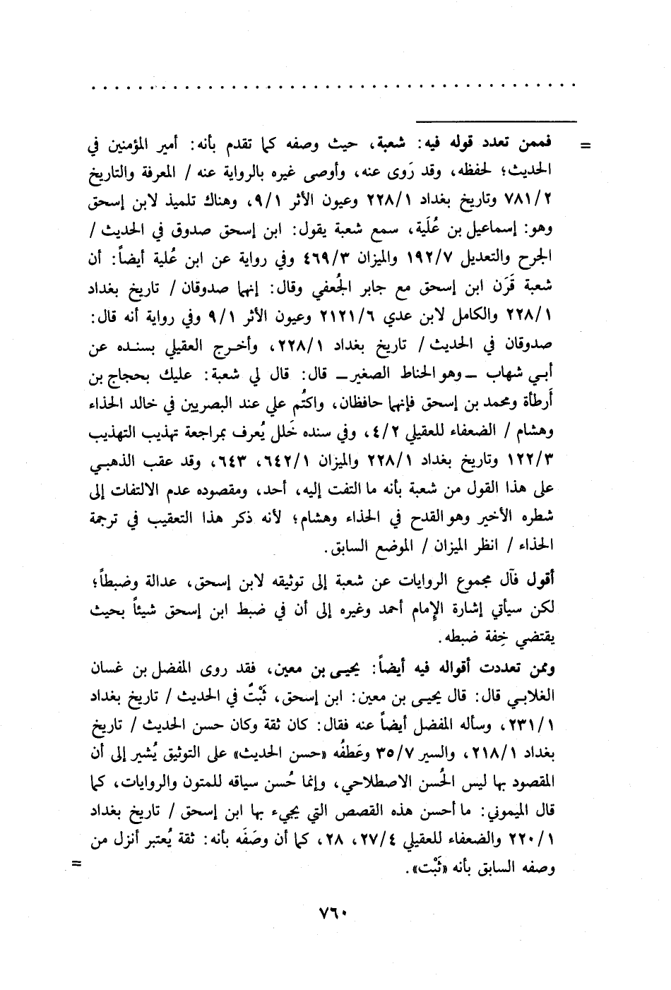 أقول فآل مجموع الروايات عن شعبة إلى توثيقه لابن إسحق، عدالة وضبطًا؛ لكن سيأتي إشارة الإمام أحمد وغيره إلى أن في ضبط ابن إسحق شيئًا بحيث يقتضي خِفة ضبطه.