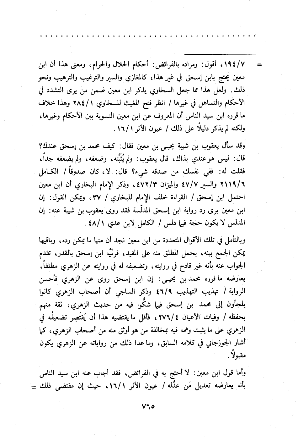 = 7/ 194، أقول: ومراده بالفرائض: أحكام الحلال والحرام، ومعنى هذا أن ابن معين يحتج بابن إسحق في غير هذا، كالمغازي والسير والترغيب والترهيب ونحو ذلك. ولعل هذا مما جعل السخاوي يذكر ابن معين ضمن من يرى التشدد في الأحكام والتساهل في غيرها/ انظر فتح المغيث للسخاوي 1/ 284 وهذا خلاف ما قرره ابن سيد الناس أن المعروف عن ابن معين التسوية بين الأحكام وغيرها، ولكنه لم يذكر دليلًا على ذلك/ عيون الأثر 1/ 16.