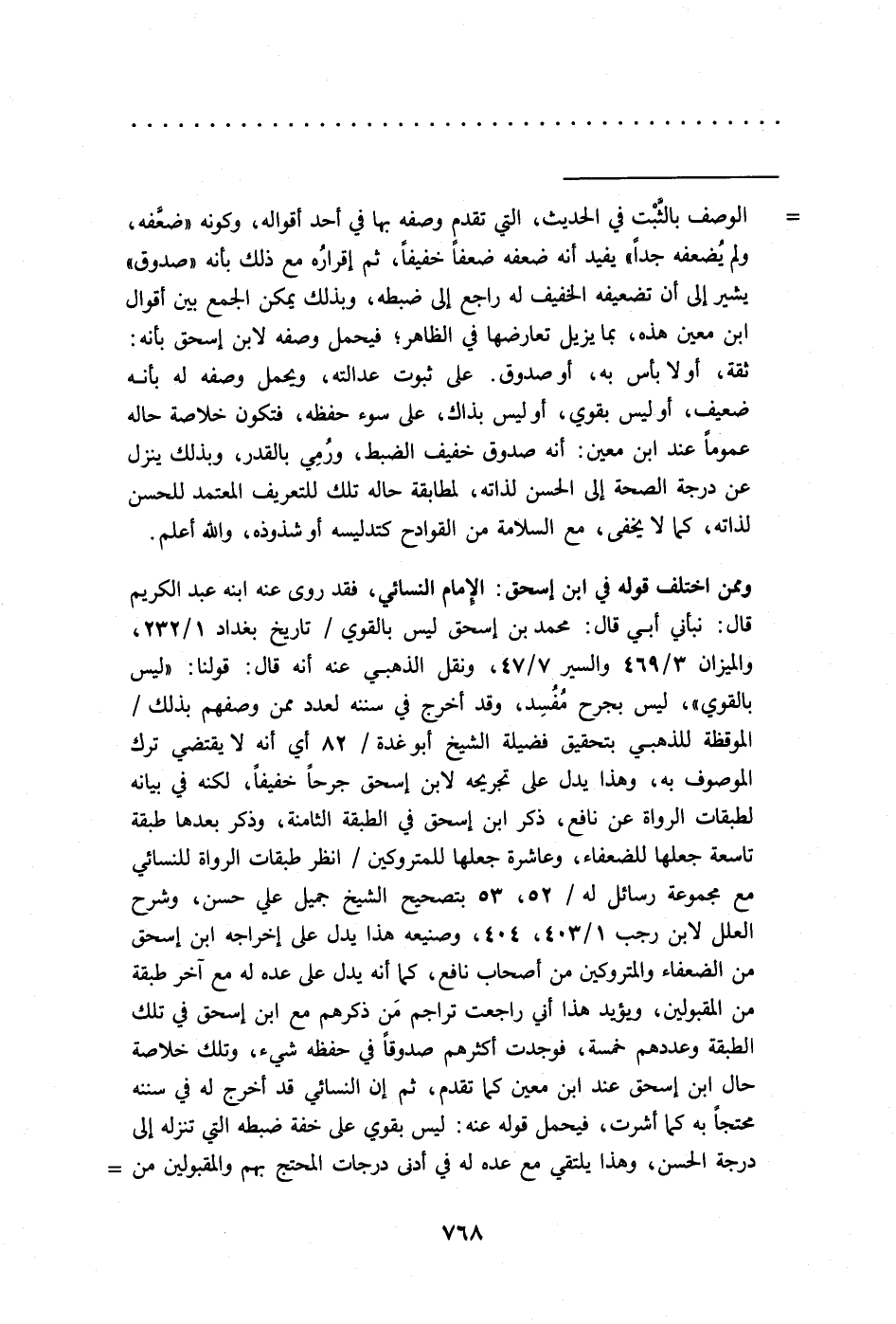 = الوصف بالثَّبْت في الحديث، التي تقدم وصفه بها في أحد أقواله، وكونه "ضعَّفه، ولم يُضعفه جدًّا" يفيد أنه ضعفه ضعفا خفيفًا، ثم إقرارُه مع ذلك بأنه "صدوق" يشير إلى أن تضعيفه الخفيف له راجع الى ضبطه، وبذلك يمكن الجمع بين أقوال ابن معين هذه، بما يزيل تعارضها في الظاهر؛ فيحمل وصفه لابن إسحق بأنه: ثقة، أو لا بأس به، أو صدوق. على ثبوت عدالته، ويحمل وصفه له بأنه ضعيف، أو ليس بقوي، أو ليس بذاك، على سوء حفظه، فتكون خلاصة حاله عمومًا عند ابن معين: أنه صدوق خفيف الضبط، ورُمِي بالقدر، وبذلك ينزل عن درجة الصحة إلى الحسن لذاته، لمطابقة حاله تلك للتعريف المعتمد للحسن لذاته، كما لا يخفى، مع السلامة من القوادح كتدليسه أو شذوذه، والله أعلم.