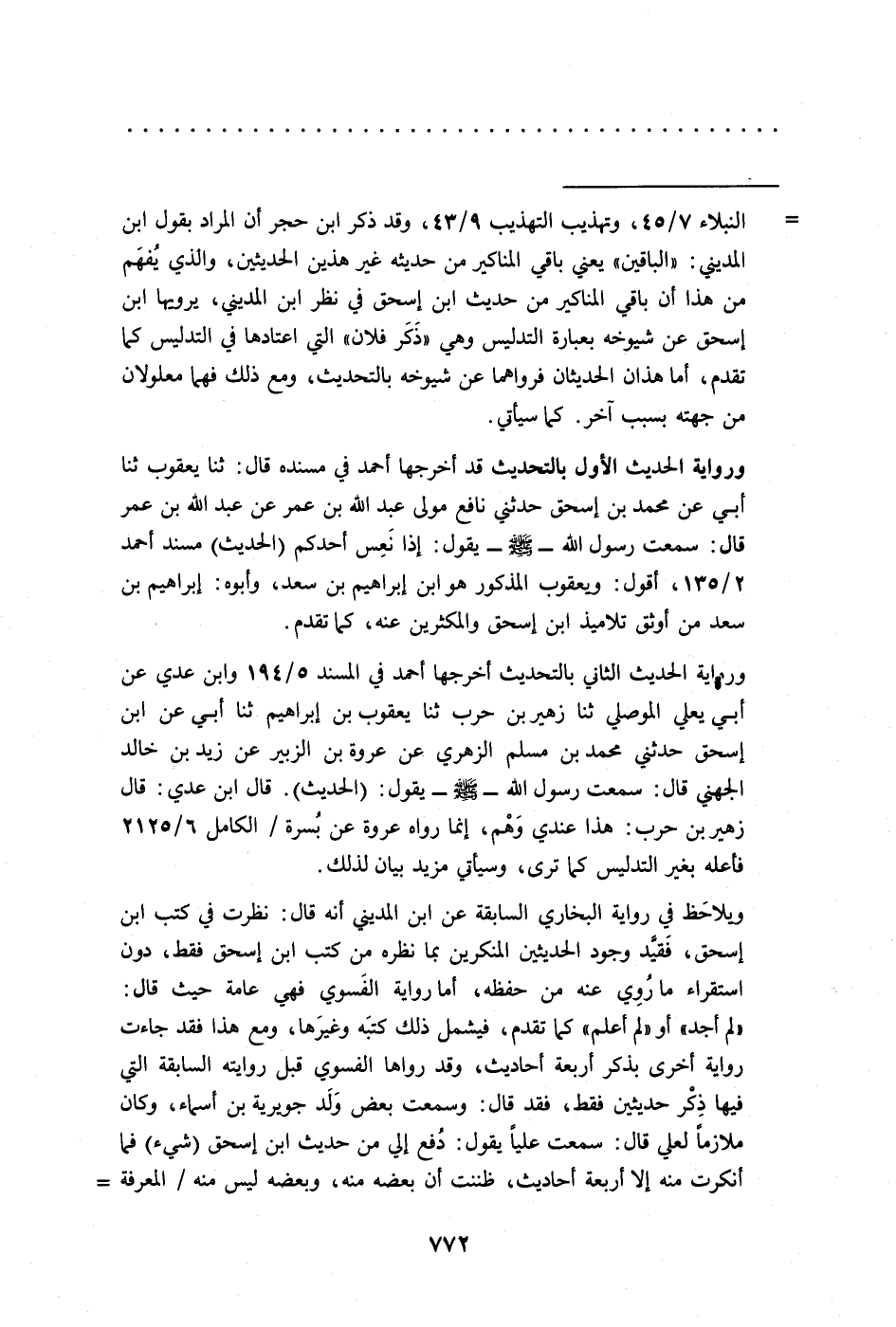 = النبلاء 7/ 45، وتهذيب التهذيب 9/ 43، وقد ذكر ابن حجر أن المراد بقول ابن المديني: "الباقين" يعني باقي المناكير من حديثه غير هذين الحديثين، والذي يُفهَم من هذا أن باقي المناكير من حديث ابن إسحق في نظر ابن المديني، يرويها ابن إسحق عن شيوخه بعبارة التدليس وهي "ذَكَر فلان" التي اعتادها في التدليس كما تقدم، أما هذان الحديثان فرواهما عن شيوخه بالتحديث، ومع ذلك فهما معلولان من جهته بسبب آخر. كما سيأتي.