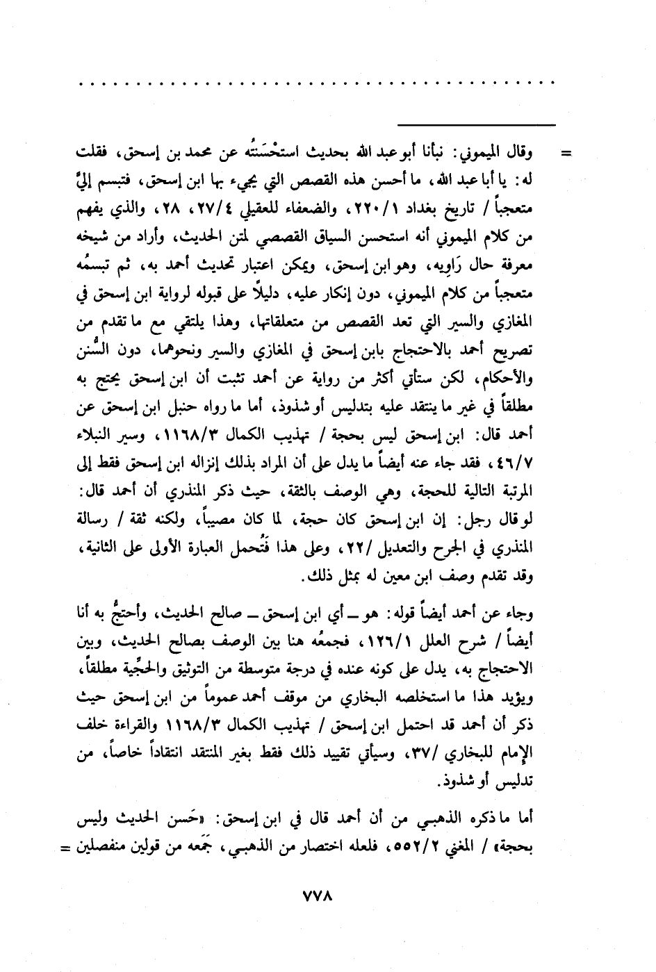 = وقال الميموني: نبأنا أبو عبد الله بحديث استحْسَنتُه عن محمد بن إسحق، فقلت له: يا أبا عبد الله، ما أحسن هذه القصص التي يجيء بها ابن إسحق، فتبسم إليّ متعجبًا/ تاريخ بغداد 1/ 220، والضعفاء للعقيلي 4/ 27، 28، والذي يفهم من كلام الميموني أنه استحسن السياق القصصي لمتن الحديث، وأراد من شيخه معرفة حال رَاوِيه، وهو ابن إسحق، ويمكن اعتبار تحديث أحمد به، ثم تبسمُه متعجبًا من كلام الميموني، دون إنكار عليه، دليلًا على قبوله لرواية ابن إسحق في المغازي والسير التي تعد القصص من متعلقاتها، وهذا يلتقي مع ما تقدم من تصريح أحمد بالاحتجاج بابن إسحق في المغازي والسير ونحوهما، دون السُّنن والأحكام، لكن ستأتي أكثر من رواية عن أحمد تثبت أن ابن إسحق يحتج به مطلقًا في غير ما ينتقد عليه بتدليس أو شذوذ، أما ما رواه حنبل ابن إسحق عن أحمد قال: ابن إسحق ليس بحجة/ تهذيب الكمال 3/ 1168، وسير النبلاء 7/ 46، فقد جاء عنه أيضًا ما يدل على أن المراد بذلك إنزاله ابن إسحق فقط إلى المرتبة التالية للحجة، وهي الوصف بالثقة، حيث ذكر المنذري أن أحمد قال: لو قال رجل: إن ابن إسحق كان حجة، لما كان مصيبًا، ولكنه ثقة/ رسالة المنذري في الجرح والتعديل/ 22، وعلى هذا فَتُحمل العبارة الأولى على الثانية، وقد تقدم وصف ابن معين له بمثل ذلك.