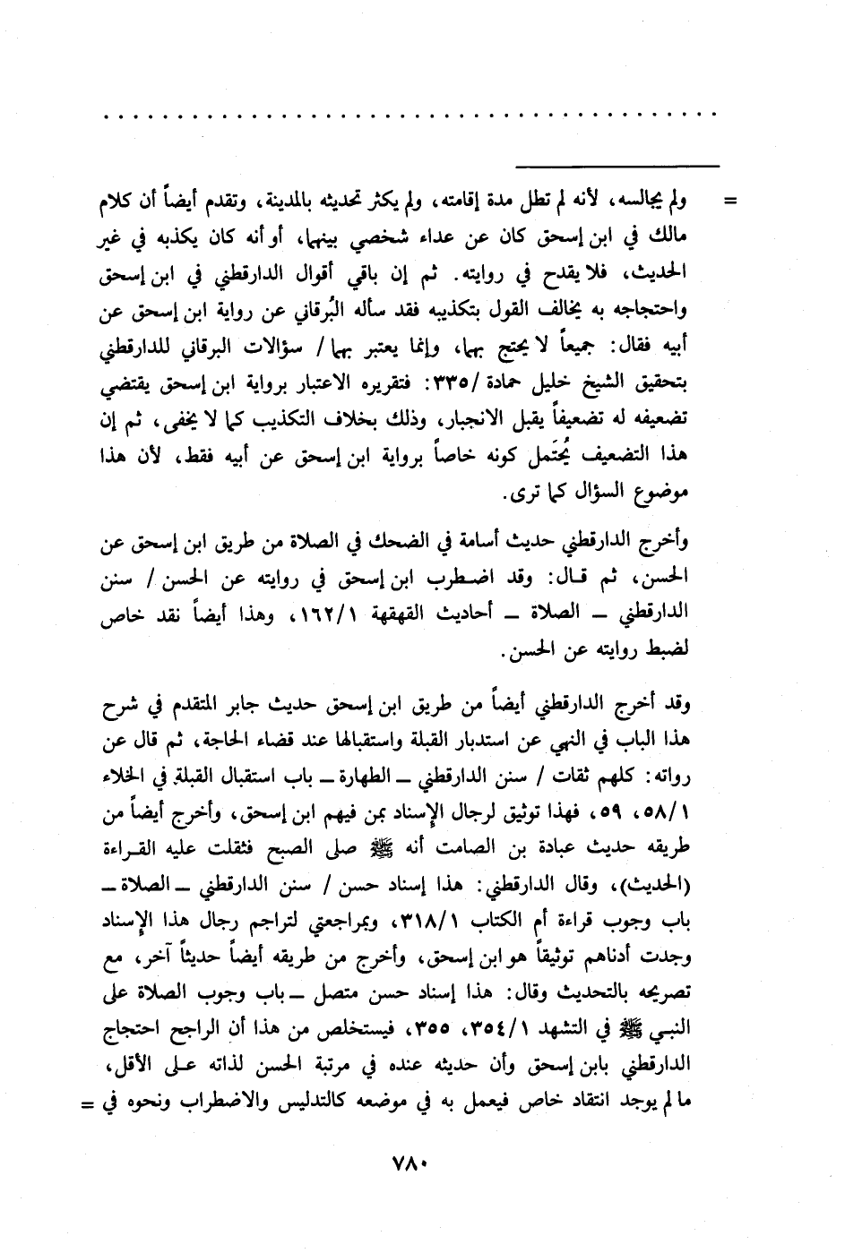 وأخرج الدارقطني حديث أسامة في الضحك في الصلاة من طريق ابن إسحق عن الحسن، ثم قال: وقد اضطرب ابن إسحق في روايته عن الحسن/ سنن الدارقطني - الصلاة - أحاديث القهقهة 1/ 162، وهذا أيضًا نقد خاص لضبط روايته عن الحسن.