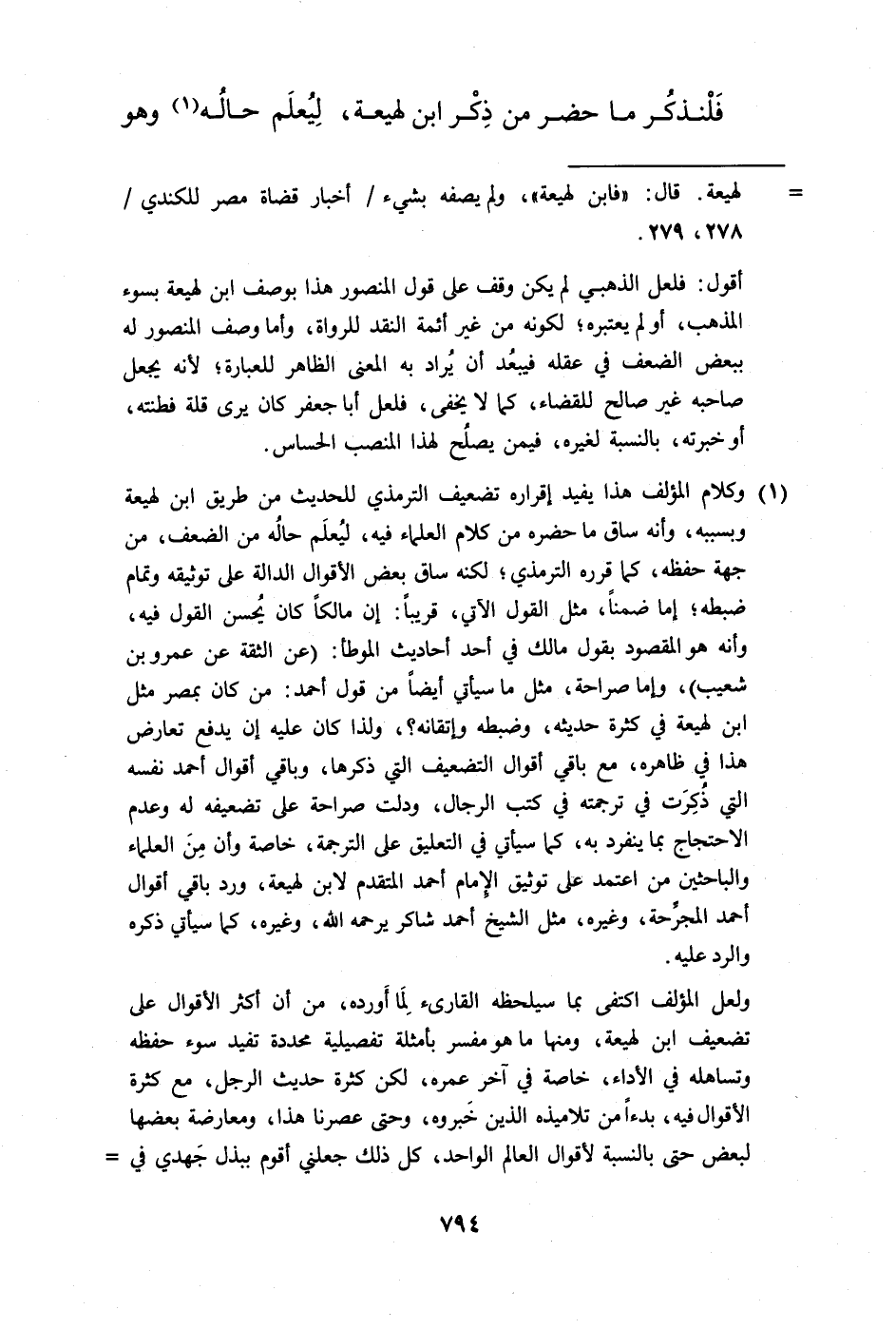 (¬1) وكلام المؤلف هذا يفيد إقراره تضعيف الترمذي للحديث من طريق ابن لهيعة وبسببه، وأنه ساق ما حضره من كلام العلماء فيه، ليُعلَم حالُه من الضعف، من جهة حفظه، كما قرره الترمذي؛ لكنه ساق بعض الأقوال الدالة على توثيقه وتمام ضبطه؛ إما ضمنًا، مثل القول الآتي، قريبًا: إن مالكًا كان يُحسن القول فيه، وأنه هو المقصود بقول مالك في أحد أحاديث الموطأ: (عن الثقة عن عمرو بن شعيب)، وإما صراحة، مثل ما سيأتي أيضًا من قول أحمد: من كان بمصر مثل ابن لهيعة في كثرة حديثه، وضبطه وإتقانه؟، ولذا كان عليه إن يدفع تعارض هذا في ظاهره، مع باقي أقوال التضعيف التي ذكرها، وباقي أقوال أحمد نفسه التي ذُكِرَت في ترجمته في كتب الرجال، ودلت صراحة على تضعيفه له وعدم الاحتجاج بما ينفرد به، كما سيأتي في التعليق على الترجمة، خاصة وأن مِنَ العلماء والباحثين من اعتمد على توثيق الإمام أحمد المتقدم لابن لهيعة، ورد باقي أقوال أحمد المجرحة، وغيره، مثل الشيخ أحمد شاكر يرحمه الله، وغيره، كما سيأتي ذكره والرد عليه.