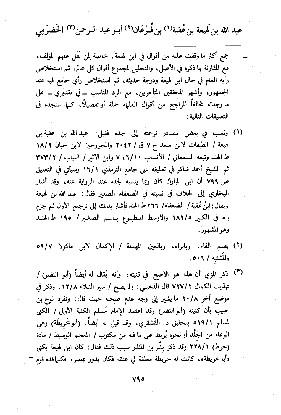 (¬1) ونسب في بعض مصادر ترجمته إلى جده فقيل: عبد الله بن عقبة بن لهيعة/ الطبقات لابن سعد ج 7 ق/ 2042 والمجروحين لابن حبان 2/ 18 ط الهند وتبعه السمعاني/ الأنساب 10/ 6، 7 وابن الأثير/ اللباب/ 2/ 373 ثم الشيخ أحمد شاكر في تعليقه على جامع الترمذي 1/ 16 وسيأتي في التعليق ص 799 أن ابن المبارك كان ربما ينسبه لجده عند الرواية عنه، وقد أشار البخاري إلى الخلاف في نسبته في الضعفاء الصغير فقال: عبد الله بن لهيعة ويقال: ابنُ عُقبة/ الضعفاء/ 266 ط الهند فأشار بذلك إلى ترجيح الأول ثم جزم به في الكبير 5/ 182 والأوسط المطبوع باسم الصغير/ 195 ط الهند وهو المشهور.