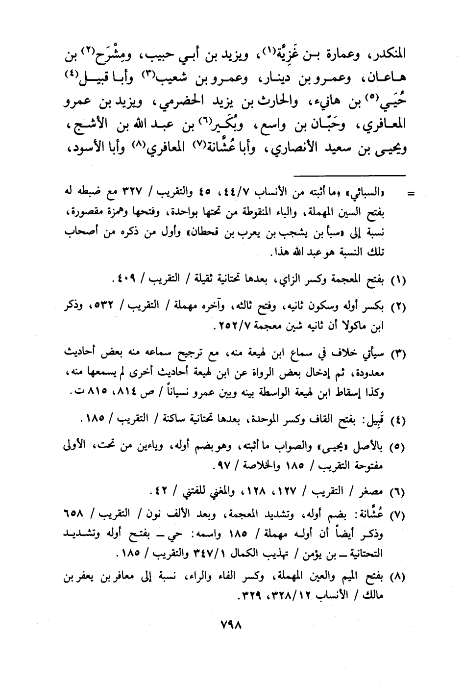 = "السبائي" وما أثبته من الأنساب 7/ 44، 45 والتقريب/ 327 مع ضبطه له بفتح السين المهملة، والباء المنقوطة من تحتها بواحدة، وفتحها وهمزة مقصورة، نسبة إلى "سبأ بن يشجب بن يعرب بن قحطان" وأول من ذكره من أصحاب تلك النسبة هو عبد الله هذا.