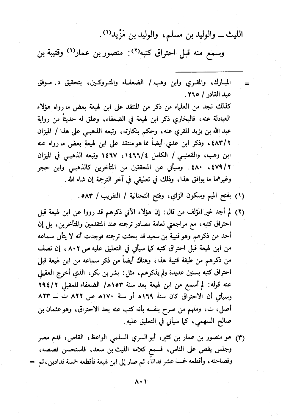 (¬2) لم أجد غير المؤلف من قال: إن هؤلاء الآتي ذكرهم قد رووا عن ابن لهيعة قبل احتراق كتبه، مع مراجعتي لعامة مصادر ترجمته عند المتقدمين والمتأخرين، بل إن أحد من ذكرهم وهو قتيبة بن سعيد قد بحثت ترجمته فوجدت أنه لا يتأتى سماعه من ابن لهيعة قبل احتراق كتبه كما سيأتي في التعليق عليه ص 802، إن نصف من ذكرهم من طبقة قتيبة هذا، وهناك أيضًا من ذكر سماعه من ابن لهيعة قبل احتراق كتبه بسنين عديدة ولم يذكرهم، مثل: بشر بن بكر، الذي أخرج العقيلي عنه قوله: لم أسمع من ابن لهيعة بعد سنة 153 هـ/ الضعفاء للعقيلي 2/ 294 وسيأتي أن الاحتراق كان سنة 169 هـ أو سنة 170 هـ ص 822 ت - 823 أصل، ت، ومنهم من صرح بنفسه بأنه كتب عنه بعد الاحتراق، وهو عثمان بن صالح السهمي، كما سيأتي في التعليق عليه.