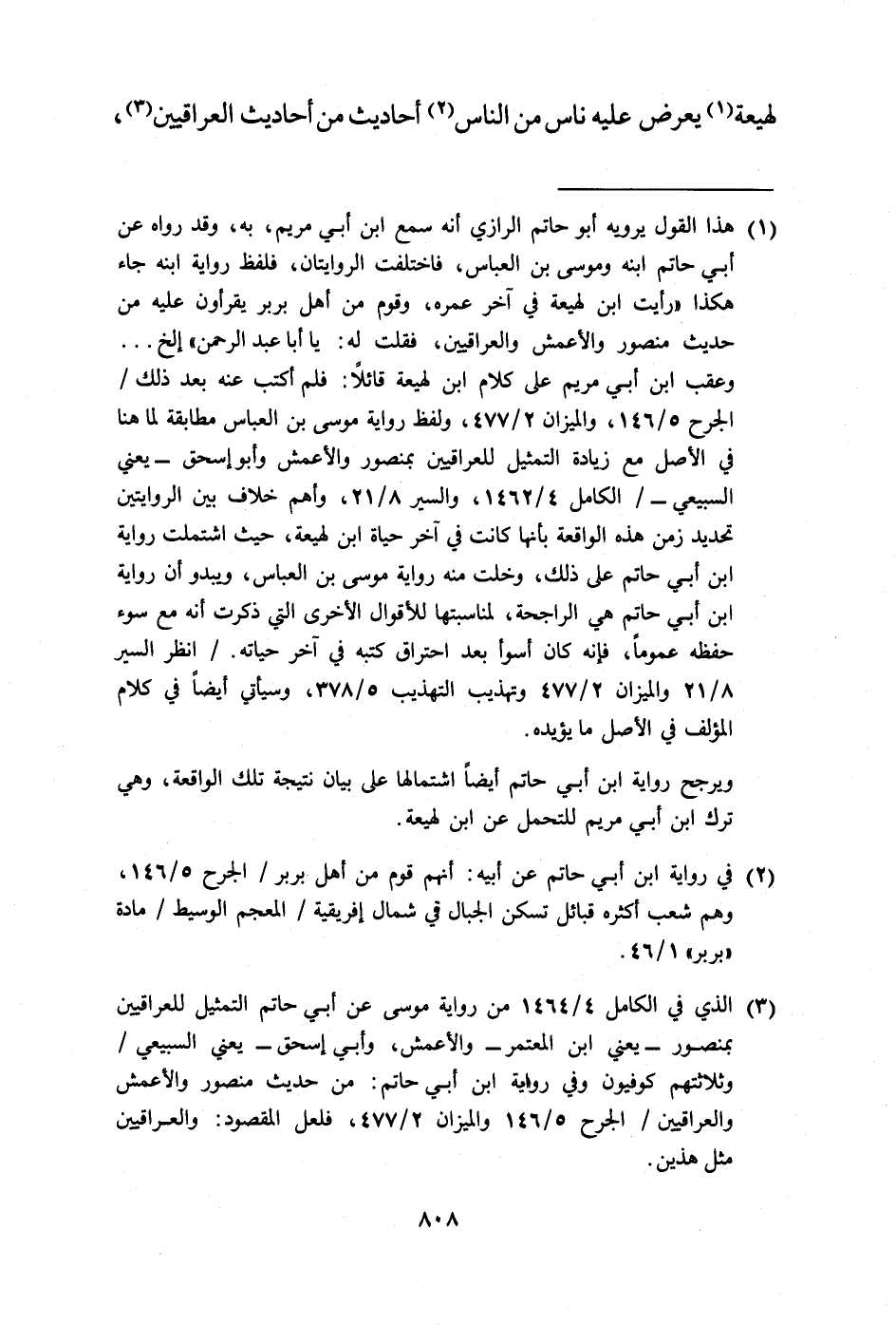 (¬3) الذي في الكامل 4/ 1464 من رواية موسى عن أبي حاتم التمثيل للعراقيين بمنصور -يعني ابن المعتمر- والأعمش، وأبي إسحق -يعني السبيعي/ وثلاثتهم كوفيون وفي رواية ابن أبي حاتم: من حديث منصور والأعمش والعراقيين/ الجرح 5/ 146 والميزان 2/ 477، فلعل المقصود: والعراقيين مثل هذين.