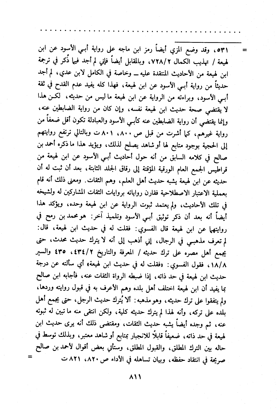 = 531، وقد وضع المزي أيضًا رمز ابن ماجه على رواية أبي الأسود عن ابن لهيعة/ تهذيب الكمال 2/ 728، وبالمقابل أيضًا فإني لم أجد فيما ذُكر في ترجمة ابن لهيعة من الأحاديث المنتقدة عليه - وخاصة في الكامل لابن عدي، لم أجد حديثًا من رواية أبي الأسود عن ابن لهيعة، فهذا كله يفيد عدم القدح في ثقة أبي الأسود، وبراءته من الرواية عن ابن لهيعة ما ليس من حديثه، لكن هذا لا يقتضي صحة حديث ابن لهيعة نفسه، وإن كان من رواية الضابطين عنه، وإنما يقتضي أن رواية الضابطين عنه كأبي الأسود والعبادلة تكون أقل ضعفًا من رواية غيرهم، كما أشرت من قبل ص 800، 801 ت وبالتالي ترتفع روايتهم إلى الحجية بوجود متابع لها أو شاهد يصلح لذلك، ويؤيد هذا ما ذكره أحمد بن صالح في كلامه السابق من أنه حول أحاديث أبي الأسود عن ابن لهيعة من قراطيس الجمع العام الورقية المؤقتة إلى رقاق الجلد الثابتة، بعد أن ثبت له أن حديثه عن ابن لهيعة يشبه حديث أهل العلم، وهم الثقات. ومعنى ذلك أنه قام بعملية الاعتبار الاصطلاحية فقارن رواياته بروايات الثقات المشاركين له ولشيخه في تلك الأحاديث، ولم يعتمد ثبوت الرواية عن ابن لهيعة وحده، ويؤكد هذا أيضًا أنه بعد أن ذكر توثيق أبي الأسود وتلميذ آخر: هو محمد بن رمح في روايتهما عن ابن لهيعة قال الفسوي: فقلت له في حديث ابن لهيعة، قال: لم تعرف مذهبي في الرجال، إني أذهب إلى أنه لا يترك حديث محدث، حتى يجمع أهل مصره على ترك حديثه/ المعرفة والتاريخ 2/ 434، 435 والسير 8/ 18، فقول الفسوي: "فقلت له في حديث ابن لهيعة، أي سألته عن درجة حديث ابن لهيعة في حد ذاته، إذا ضبطه الرواة الثقات عنه، فأجابه ابن صالح بما يفيد أن ابن لهيعة اختلف أهل بلده وهم الأعرف به في قبول روايته وردها، ولم يتفقوا على ترك حديثه، وهو مذهبه: ألا يُترك حديث الرجل، حتى يجمع أهل بلده على تركه، وأنه لهذا لم يترك حديثه كلية، ولكن انتقى منه ما تبين له ثبوته عنه، ثم وجده أيضًا يشبه حديث الثقات، ومقتضى ذلك أنه يرى حديث ابن لهيعة في حد ذاته، ضعيفًا قابلًا للانجبار بمتابع أو شاهد معتبر، وبذلك توسط في حاله بين الترك المطلق، والقبول المطلق، وستأتي بعض أقوال لأحمد بن صالح صريحة في انتقاد حفظه، وبيان تساهله في الأداء ص 820، 821 ت =