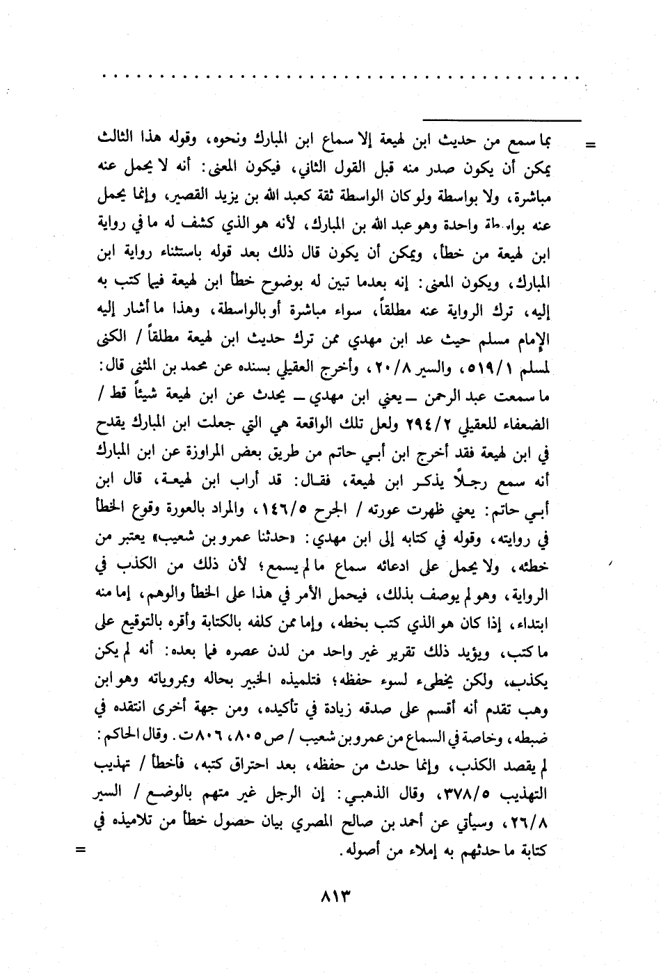 = بما سمع من حديث ابن لهيعة إلا سماع ابن المبارك ونحوه، وقوله هذا الثالث يمكن أن يكون صدر منه قبل القول الثاني، فيكون المعنى: أنه لا يحمل عنه مباشرة، ولا بواسطة ولو كان الواسطة ثقة كعبد الله بن يزيد القصير، وإنما يحمل عنه بواسطة واحدة وهو عبد الله بن المبارك، لأنه هو الذي كشف له ما في رواية ابن لهيعة من خطأ، ويمكن أن يكون قال ذلك بعد قوله باستثناء رواية ابن المبارك، ويكون المعنى: إنه بعدما تبين له بوضوح خطأ ابن لهيعة فيما كتب به إليه، ترك الرواية عنه مطلقًا، سواء مباشرة أو بالواسطة، وهذا ما أشار اليه الإمام مسلم حيث عد ابن مهدي ممن ترك حديث ابن لهيعة مطلقًا/ الكنى لمسلم 1/ 519، والسير 8/ 20، وأخرج العقيلي بسنده عن محمد بن المثنى قال: ما سمعت عبد الرحمن -يعني ابن مهدي- يحدث عن ابن لهيعة شيئًا قط/ الضعفاء للعقيلي 2/ 294 ولعل تلك الواقعة هي التي جعلت ابن المبارك يقدح في ابن لهيعة فقد أخرج ابن أبي حاتم من طريق بعض المراوزة عن ابن المبارك أنه سمع رجلًا يذكر ابن لهيعة، فقال: قد أراب ابن لهيعة، قال ابن أبي حاتم: يعني ظهرت عورته/ الجرح 5/ 146، والمراد بالعورة وقوع الخطأ في روايته، وقوله في كتابه إلى ابن مهدي: "حدثنا عمرو بن شعيب" يعتبر من خطئه، ولا يحمل على ادعائه سماع ما لم يسمع؛ لأن ذلك من الكذب في الرواية، وهو لم يوصف بذلك، فيحمل الأمر في هذا على الخطأ والوهم، إما منه ابتداء، إذا كان هو الذي كتب بخطه، وإما ممن كلفه بالكتابة وأقره بالتوقيع على ما كتب، ويؤيد ذلك تقرير غير واحد من لدن عصره فما بعده: أنه لم يكن يكذب، ولكن يخطئ لسوء حفظه؛ فتلميذه الخبير بحاله وبمروياته وهو ابن وهب تقدم أنه أقسم على صدقه زيادة في تأكيده، ومن جهة أخرى انتقده في ضبطه، وخاصة في السماع من عمرو بن شعيب/ ص 805، 806 ت. وقال الحاكم: لم يقصد الكذب، وإنما حدث من حفظه، بعد احتراق كتبه، فأخطأ/ تهذيب التهذيب 5/ 378، وقال الذهبي: إن الرجل غير متهم بالوضع/ السير 8/ 26، وسيأتي عن أحمد بن صالح المصري بيان حصول خطأ من تلاميذه في كتابة ما حدثهم به إملاء من أصوله. =