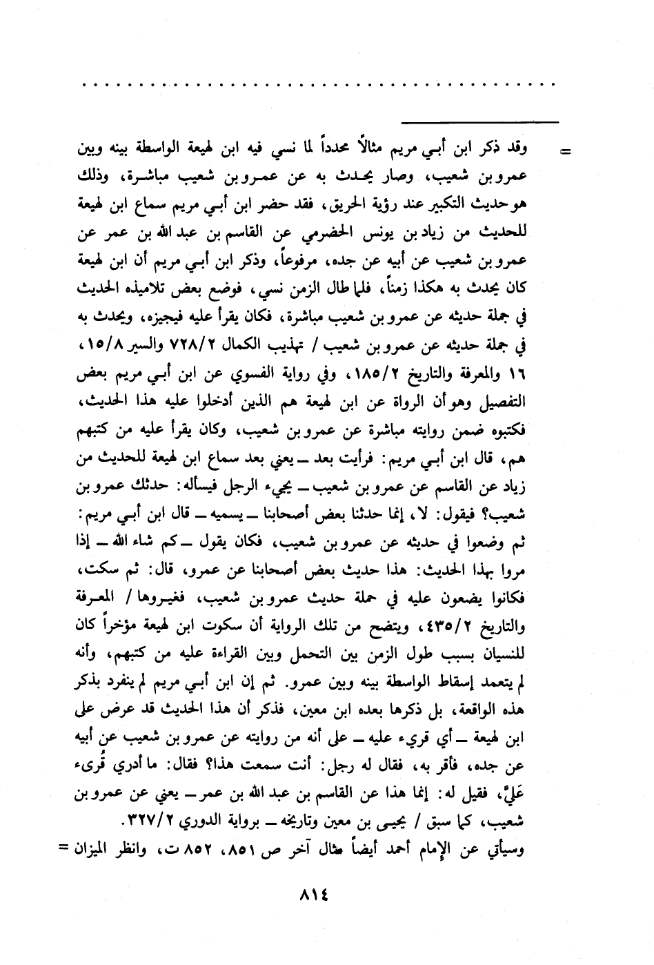 = وقد ذكر ابن أبي مريم مثالًا محددًا لما نسي فيه ابن لهيعة الواسطة بينه وبين عمرو بن شعيب، وصار يحدث به عن عمرو بن شعيب مباشرة، وذلك هو حديث التكبير عند رؤية الحريق، فقد حضر ابن أبي مريم سماع ابن لهيعة للحديث من زياد بن يونس الحضرمي عن القاسم بن عبد الله بن عمر عن عمرو بن شعيب عن أبيه عن جده، مرفوعًا، وذكر ابن أبي مريم أن ابن لهيعة كان يحدث به هكذا زمنًا، فلما طال الزمن نسي، فوضع بعض تلاميذه الحديث في جملة حديثه عن عمرو بن شعيب مباشرة، فكان يقرأ عليه فيجيزه، ويحدث به في جملة حديثه عن عمرو بن شعيب/ تهذيب الكمال 2/ 728 والسير 5/ 18، 16 والمعرفة والتاريخ 2/ 185، وفي رواية الفسوي عن ابن أبي مريم بعض التفصيل وهو أن الرواة عن ابن لهيعة هم الذين أدخلوا عليه هذا الحديث، فكتبوه ضمن روايته مباشرة عن عمرو بن شعيب، وكان يقرأ عليه من كتبهم هم، قال ابن أبي مريم: فرأيت بعد -يعني بعد سماع ابن لهيعة للحديث من زياد عن القاسم عن عمرو بن شعيب- يجيء الرجل فيسأله: حدثك عمرو بن شعيب؟ فيقول: لا، إنما حدثنا بعض أصحابنا -يسميه- قال ابن أبي مريم: ثم وضعوا في حديثه عن عمرو بن شعيب، فكان يقول -كم شاء الله- إذا مروا بهذا الحديث: هذا حديث بعض أصحابنا عن عمرو، قال: ثم سكت، فكانوا يضعون عليه في حملة حديث عمرو بن شعيب، فغيروها/ المعرفة والتاريخ 2/ 435، ويتضح من تلك الرواية أن سكوت ابن لهيعة مؤخرًا كان للنسيان بسبب طول الزمن بين التحمل وبين القراءة عليه من كتبهم، وأنه لم يتعمد إسقاط الواسطة بينه وبين عمرو. ثم إن ابن أبي مريم لم ينفرد بذكر هذه الواقعة، بل ذكرها بعده ابن معين، فذكر أن هذا الحديث قد عرض على ابن لهيعة -أي قريء عليه- على أنه من روايته عن عمرو بن شعيب عن أبيه عن جده، فأقر به، فقال له رجل: أنت سمعت هذا؟ فقال: ما أدري قُرئ عَليَّ، فقيل له: إنما هذا عن القاسم بن عبد الله بن عمر -يعني عن عمرو بن شعيب، كما سبق/ يحيى بن معين وتاريخه- برواية الدوري 2/ 327.