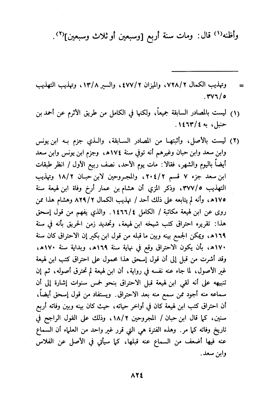 (¬2) ليست بالأصل، وأثبتها من المصادر السابقة، والذي جزم به ابن يونس وابن سعد وابن حبان وغيرهم أنه توفي سنة 174 هـ، وجزم ابن يونس وابن سعد أيضًا باليوم والشهر، فقالا: مات يوم الأحد، نصف ربيع الأول/ انظر طبقات ابن سعد جزء 7 قسم 2/ 204، والمجروحين لابن حبان 2/ 18 وتهذيب التهذيب 5/ 377، وذكر المزي أن هشام بن عمار أرخ وفاة ابن لهيعة سنة 175 هـ، وأنه لم يتابعه على ذلك أحد/ تهذيب الكمال 2/ 829 وهشام هذا ممن روى عن ابن لهيعة مكاتبة/ الكامل 4/ 1466. والذي يفهم من قول إسحق هذا: تقريره احتراق كتب شيخه ابن لهيعة، وتحديد زمن الحريق بأنه في سنة 169 هـ، ويمكن الجمع بينه وبين ما قبله من قول ابن بكير إن الاحتراق كان سنة 175 هـ، بأن يكون الاحتراق وقع قي نهاية سنة 169 هـ، وبداية سنة 170 هـ، وقد أشرت من قبل إلى أن قول إسحق هذا محمول على احتراق كتب ابن لهيعة غير الأصول، لما جاء عنه نفسه في رواية، أن ابن لهيعة لم تحترق أصوله، ثم إن تنبيهه على أنه لقي ابن لهيعة قبل الاحتراق بنحو خمس سنوات إشارة إلى أن سماعه منه أجود ممن سمع منه بعد الاحتراق. ويستفاد من قول إسحق أيضًا، أن احتراق كتب ابن لهيعة كان في أواخر حياته، حيث كان بينه وبين وفاته أربع سنين، كما قال ابن حبان/ المجروحين 2/ 18، وذلك على القول الراجح في تاريخ وفاته كما مر. وهذه الفترة هي التي قرر غير واحد من العلماء أن السماع عنه فيها أضعف من السماع عنه قبلها، كما سيأتي في الأصل عن الفلاس وابن سعد.