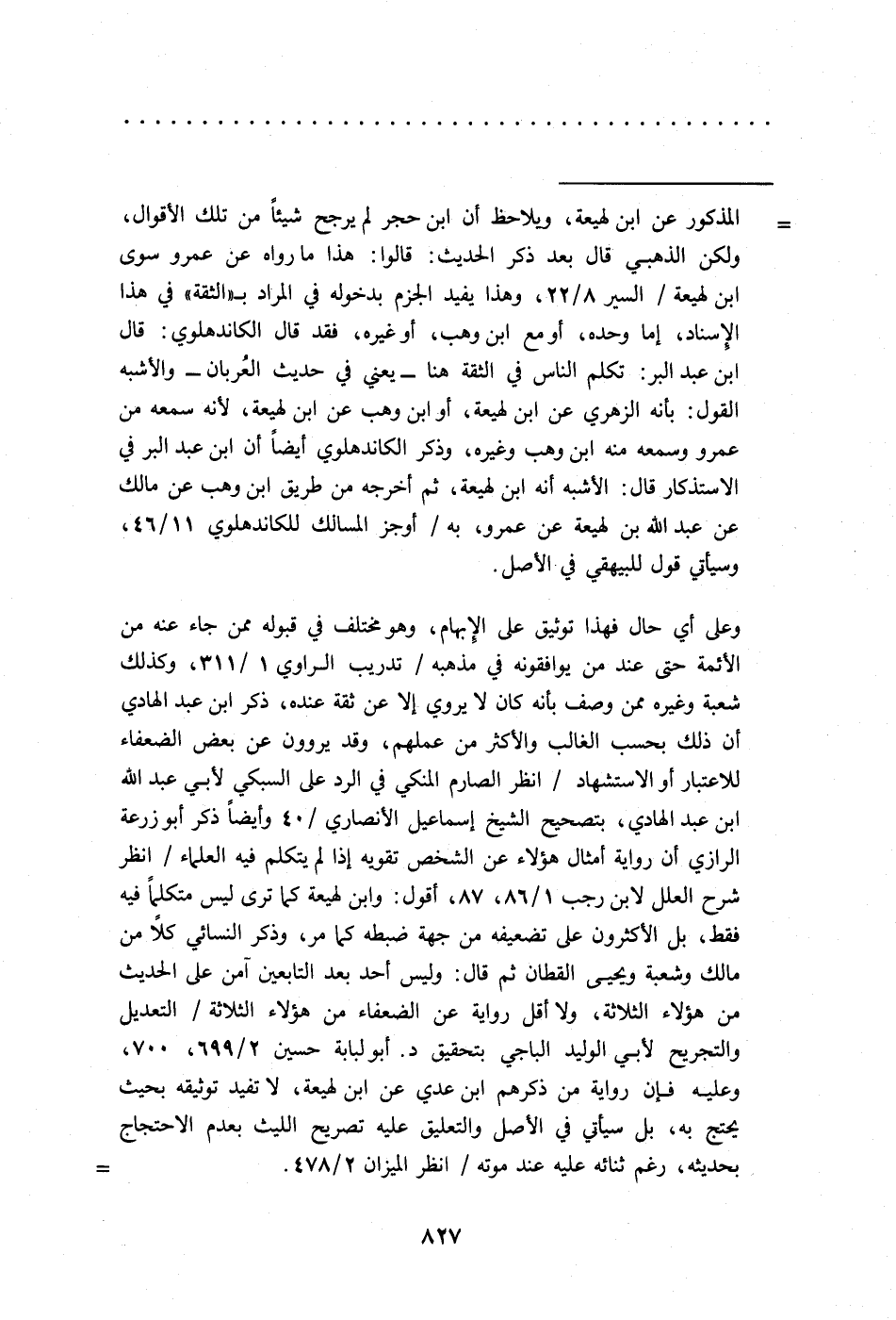 = المذكور عن ابن لهيعة، ويلاحظ أن ابن حجر لم يرجح شيئًا من تلك الأقوال، ولكن الذهبي قال بعد ذكر الحديث: قالوا: هذا ما رواه عن عمرو سوى ابن لهيعة/ السير 8/ 22، وهذا يفيد الجزم بدخوله في المراد بـ "الثقة" في هذا الإسناد، إما وحده، أو مع ابن وهب، أو غيره، فقد قال الكاندهلوي: قال ابن عبد البر: تكلم الناس في الثقة هنا -يعني في حديث العُربان- والأشبه القول: بأنه الزهري عن ابن لهيعة، أو ابن وهب عن ابن لهيعة، لأنه سمعه من عمرو وسمعه منه ابن وهب وغيره، وذكر الكاندهلوي أيضًا أن ابن عبد البر في الاستذكار قال: الأشبه أنه ابن لهيعة، ثم أخرجه من طريق ابن وهب عن مالك عن عبد الله بن لهيعة عن عمرو، به/ أوجز المسالك للكاندهلوي 11/ 46، وسيأتي قول للبيهقي في الأصل.