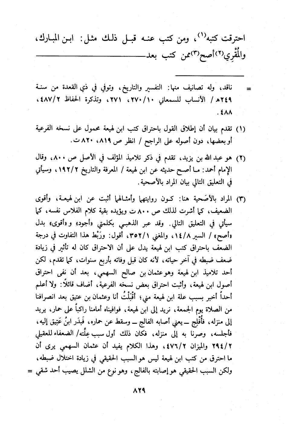 (¬1) تقدم بيان أن إطلاق القول باحتراق كتب ابن لهيعة محمول على نسخه الفرعية أو بعضها، دون أصوله على الراجح/ انظر ص 819، 820 ت.